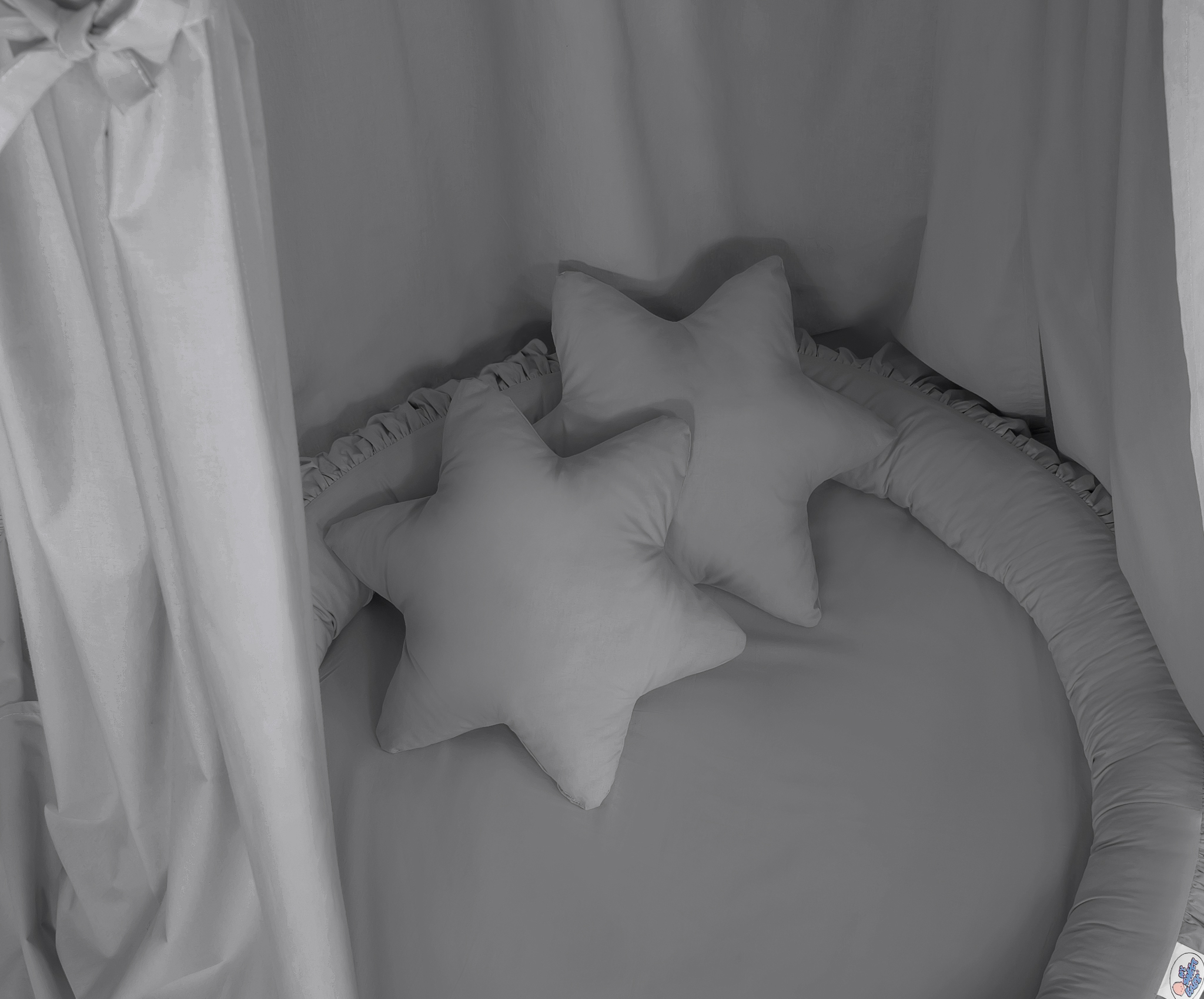 Een lange, hangende luifel van katoen. Een prachtig element in de kinderkamer. Het kan gebruikt worden als unieke decoratie van een ledikant, maar het kan eveneens een prachtige plek vormen om in te spelen. Hang de luifel over het ledikant en bescherm je baby tegen te veel licht en lawaai, het creëert tevens een knusse en veilige plek om in te rusten. De luifel kan gemakkelijk bevestigd worden aan het plafond. De lengte van 260 cm maakt het mogelijk om de uiteinden op de vloer te leggen. Dit creëert een perfecte schuilplaats en speelplek voor oudere kinderen. De luifel is gemaakt van Oekotex-gecertificeerd 100% katoen. Aan de zijkanten zitten praktische linten om de luifel vast te binden en er een prachtige tent van te maken. De rand aan de bovenkant kan worden verwijderd. De stof kan gewassen worden op 30 graden. In combinatie met het prachtige nest wordt het een perfecte plaats om plezier te maken. De zachte randen bieden een veilige omgeving voor de baby. De rand is gevuld met een gecertificeerde, niet-allergene vulling van Eco Fillball-vezels. Deze is zacht, donzig en zorgt voor een goede luchtcirculatie. De bodem van het babynest is gemaakt van een modern, anti-allergie, gecertificeerd materiaal. De bodem kan afgenomen en gewassen worden op 30 graden.