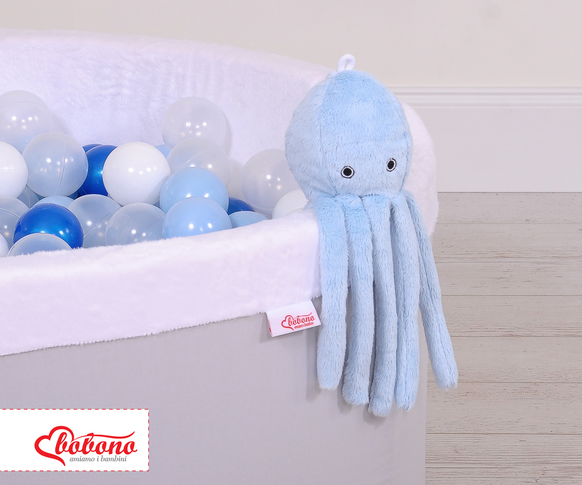 Deze leuke, knuffelige octopus is perfect voor elke baby, om te slapen en te knuffelen. De armen van de octopus zijn comfortabel vast te houden door kleine babyhandjes. De octopus is perfect veilig voor baby's vanaf de geboorte. Met een zacht rammelend geluid trekt het de aandacht van de baby. Gemaakt van zacht aanvoelend, donzig minky fleece. De vulling van het kussen bestaat uit Eco Fillball-gecertificeerde Siliconeballetjes - "kunstmatige dons" voor kussens - de vulling zorgt voor een goede luchtcirculatie en lighouding voor de baby.