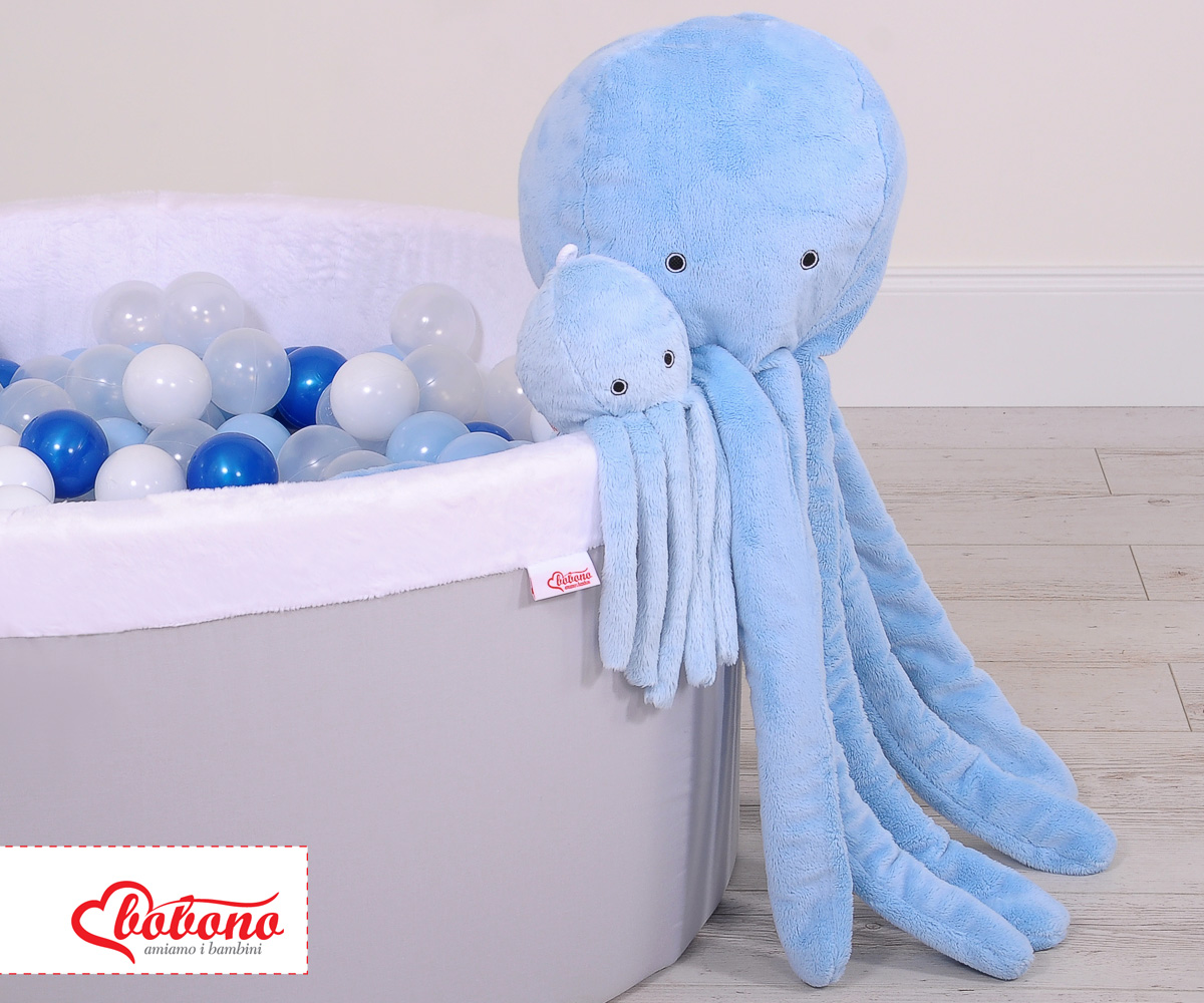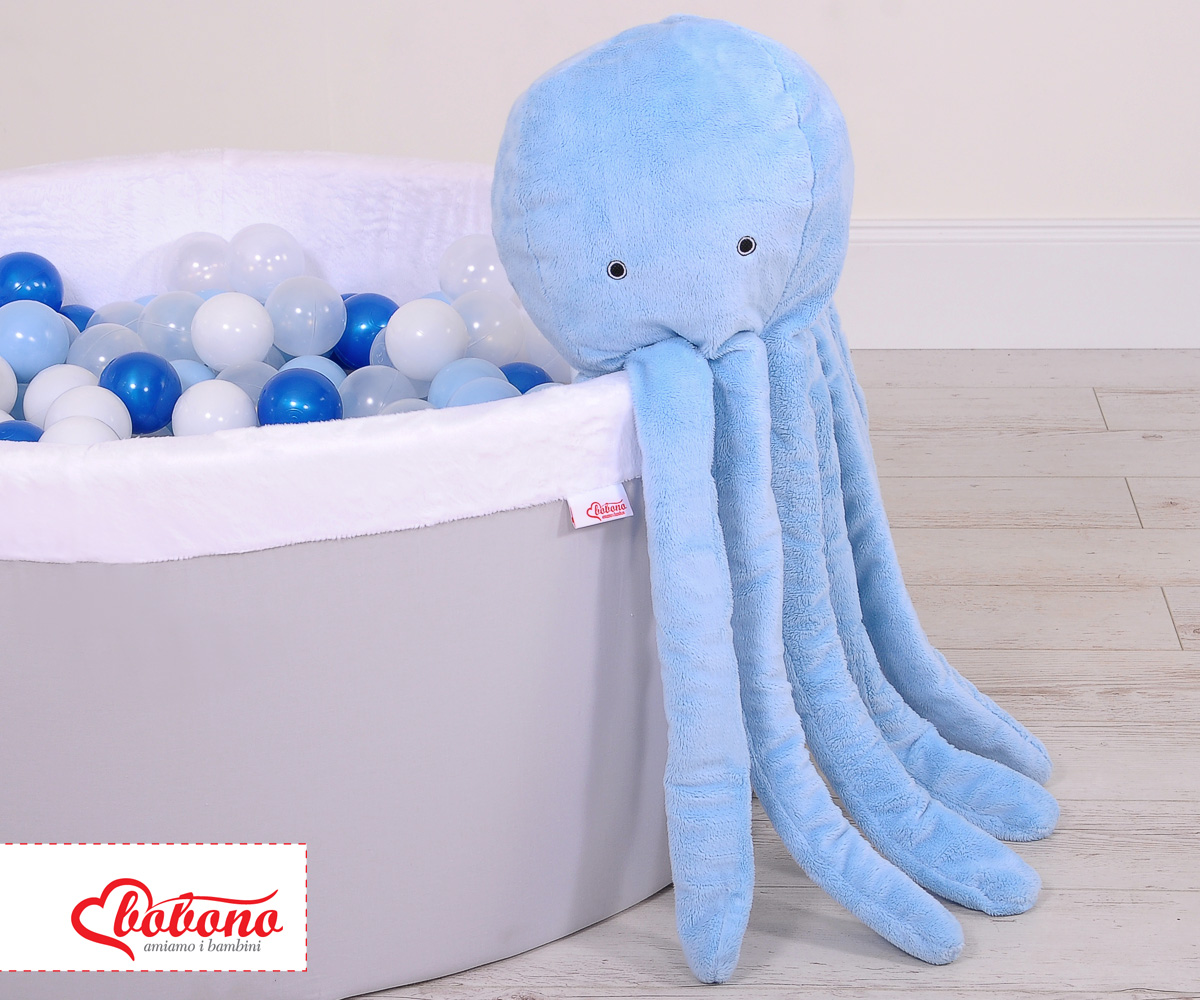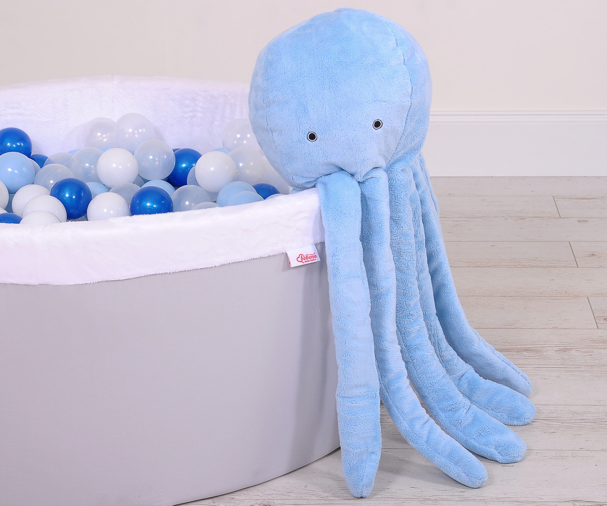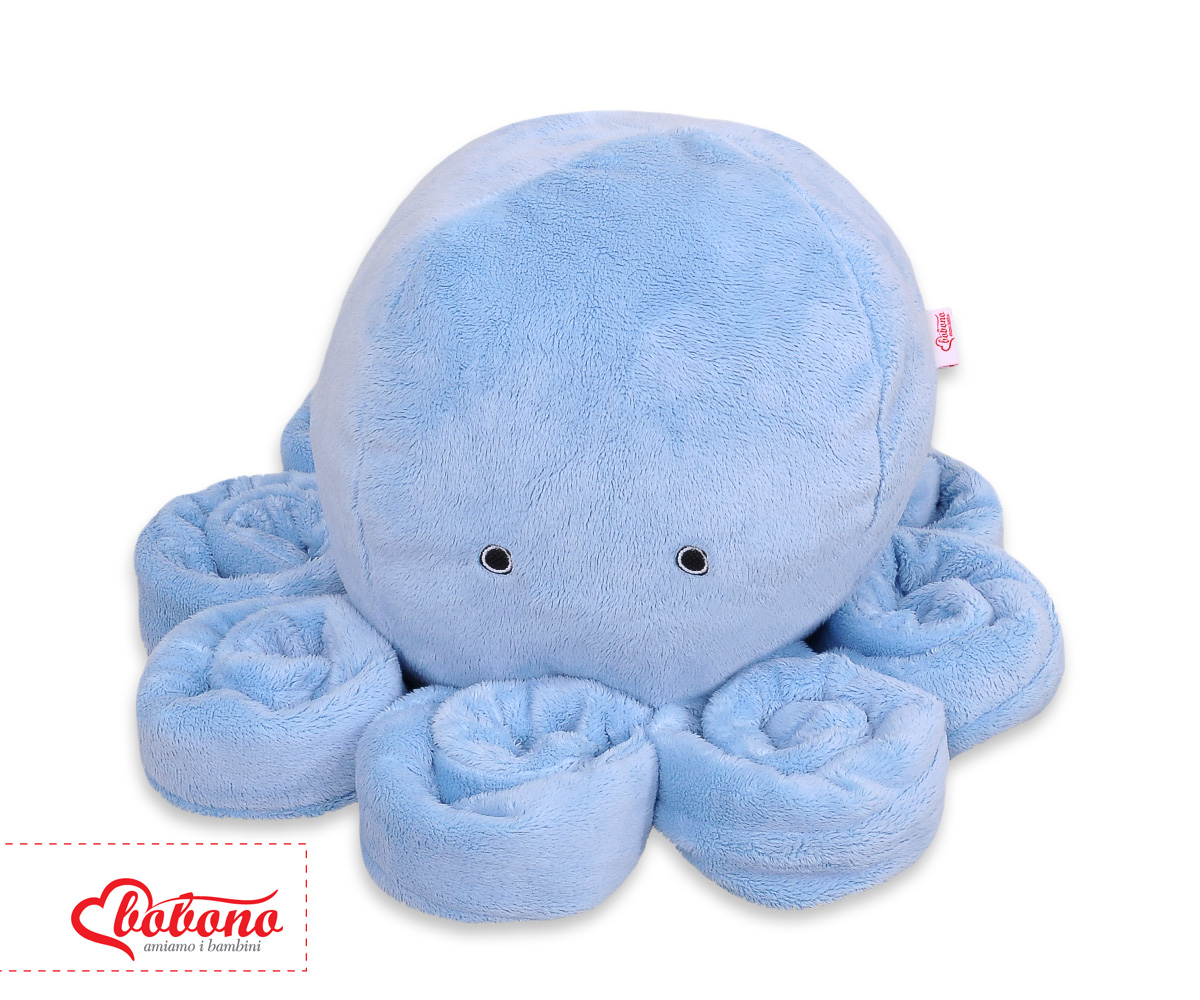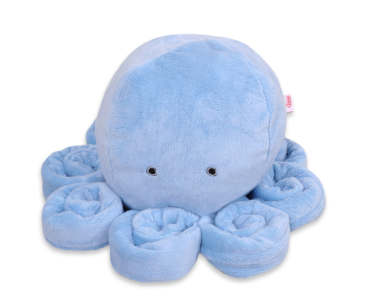 Deze leuke, knuffelige octopus is perfect voor elke baby, om te slapen en te knuffelen. De armen van de octopus zijn comfortabel vast te houden door kleine babyhandjes. De octopus is perfect veilig voor baby's vanaf de geboorte. Met een zacht rammelend geluid trekt het de aandacht van de baby. Gemaakt van zacht aanvoelend, donzig minky fleece. De vulling van het kussen bestaat uit Eco Fillball-gecertificeerde Siliconeballetjes - "kunstmatige dons" voor kussens - de vulling zorgt voor een goede luchtcirculatie en lighouding voor de baby.