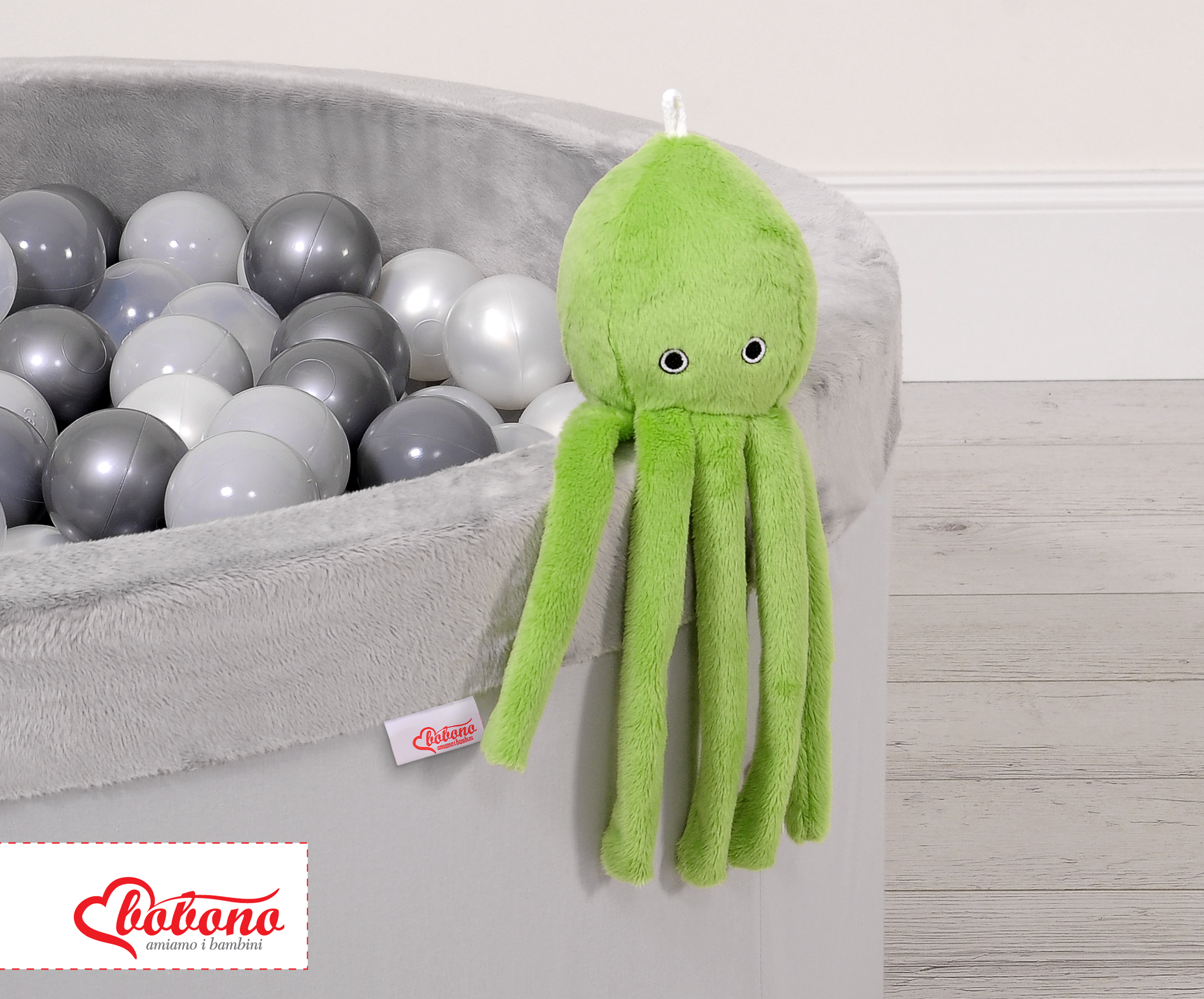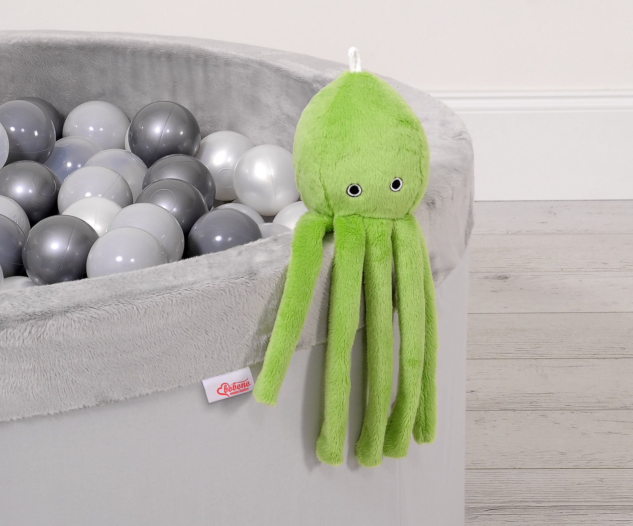 Deze leuke, knuffelige octopus is perfect voor elke baby, om te slapen en te knuffelen. De armen van de octopus zijn comfortabel vast te houden door kleine babyhandjes. De octopus is perfect veilig voor baby's vanaf de geboorte. Met een zacht rammelend geluid trekt het de aandacht van de baby. Gemaakt van zacht aanvoelend, donzig minky fleece. De vulling van het kussen bestaat uit Eco Fillball-gecertificeerde Siliconeballetjes - "kunstmatige dons" voor kussens - de vulling zorgt voor een goede luchtcirculatie en lighouding voor de baby.