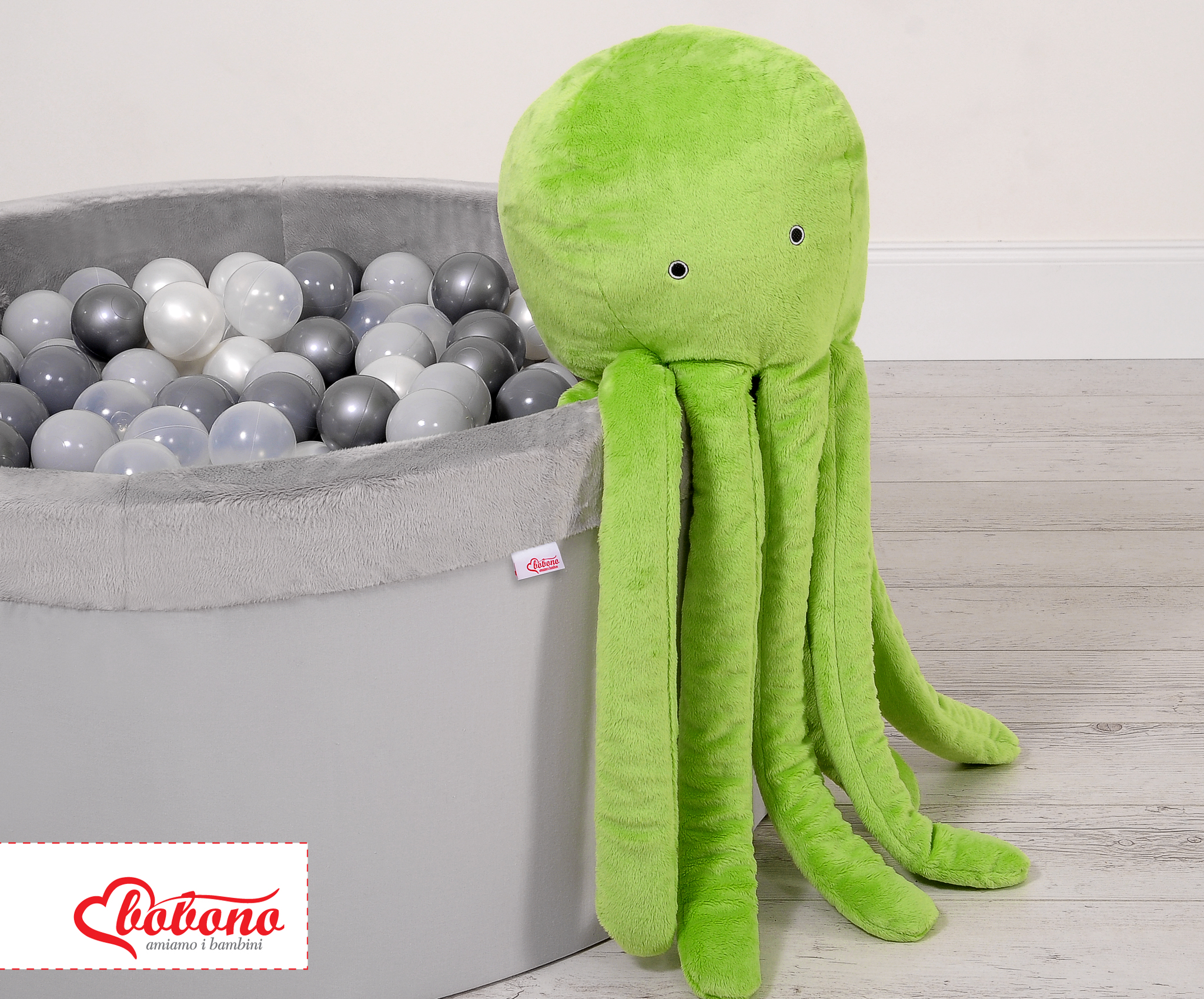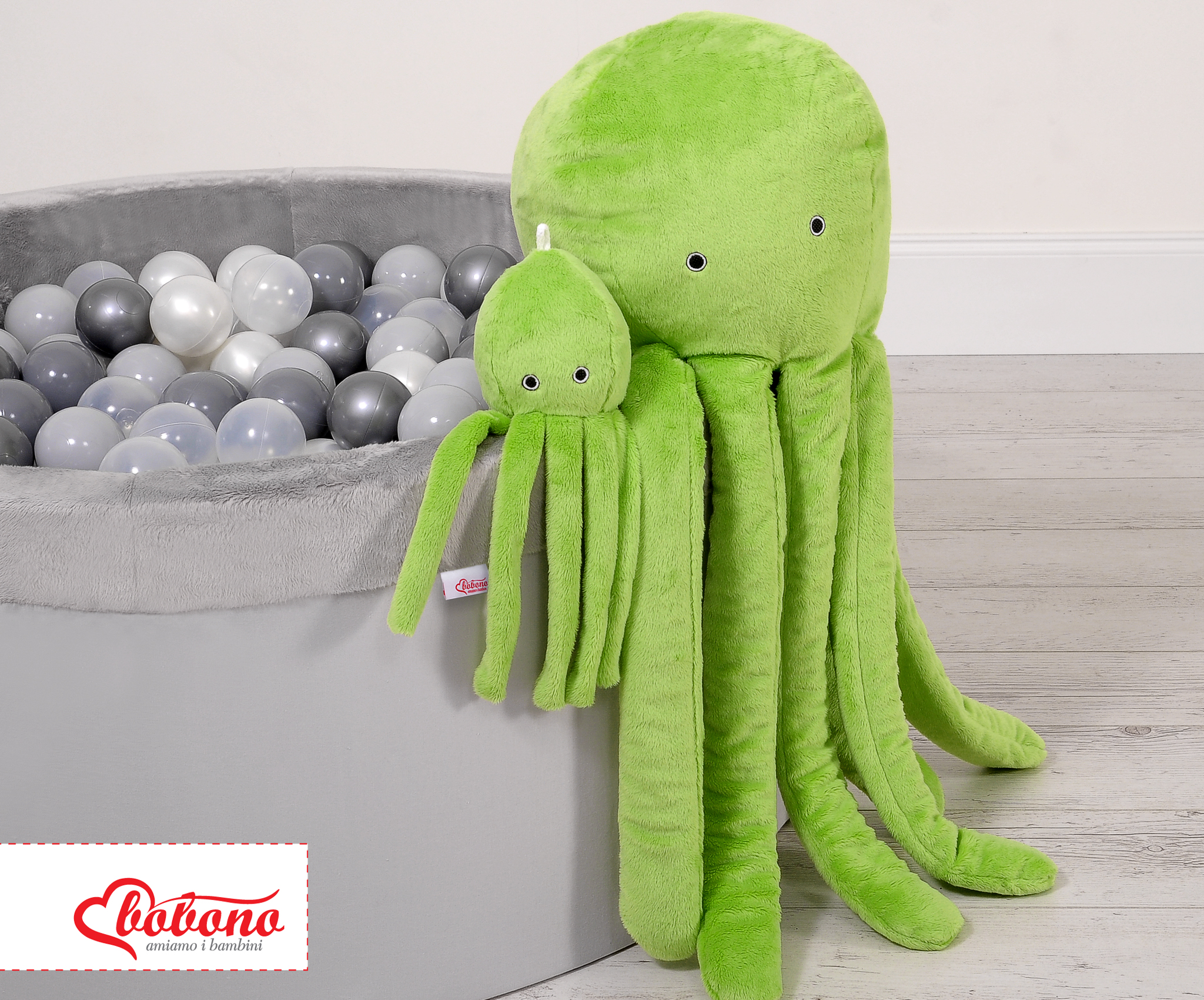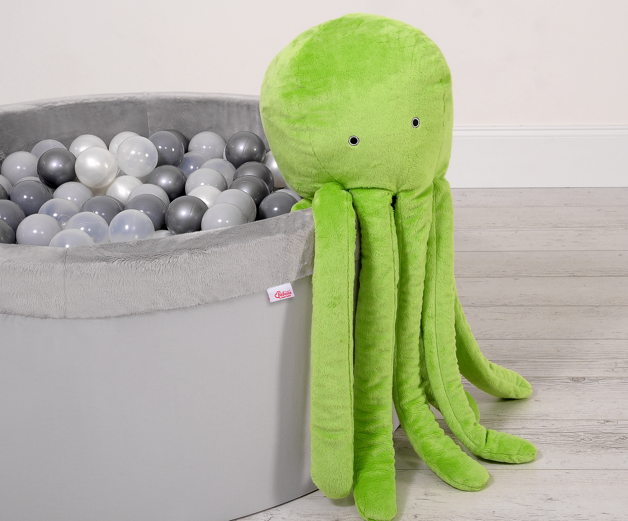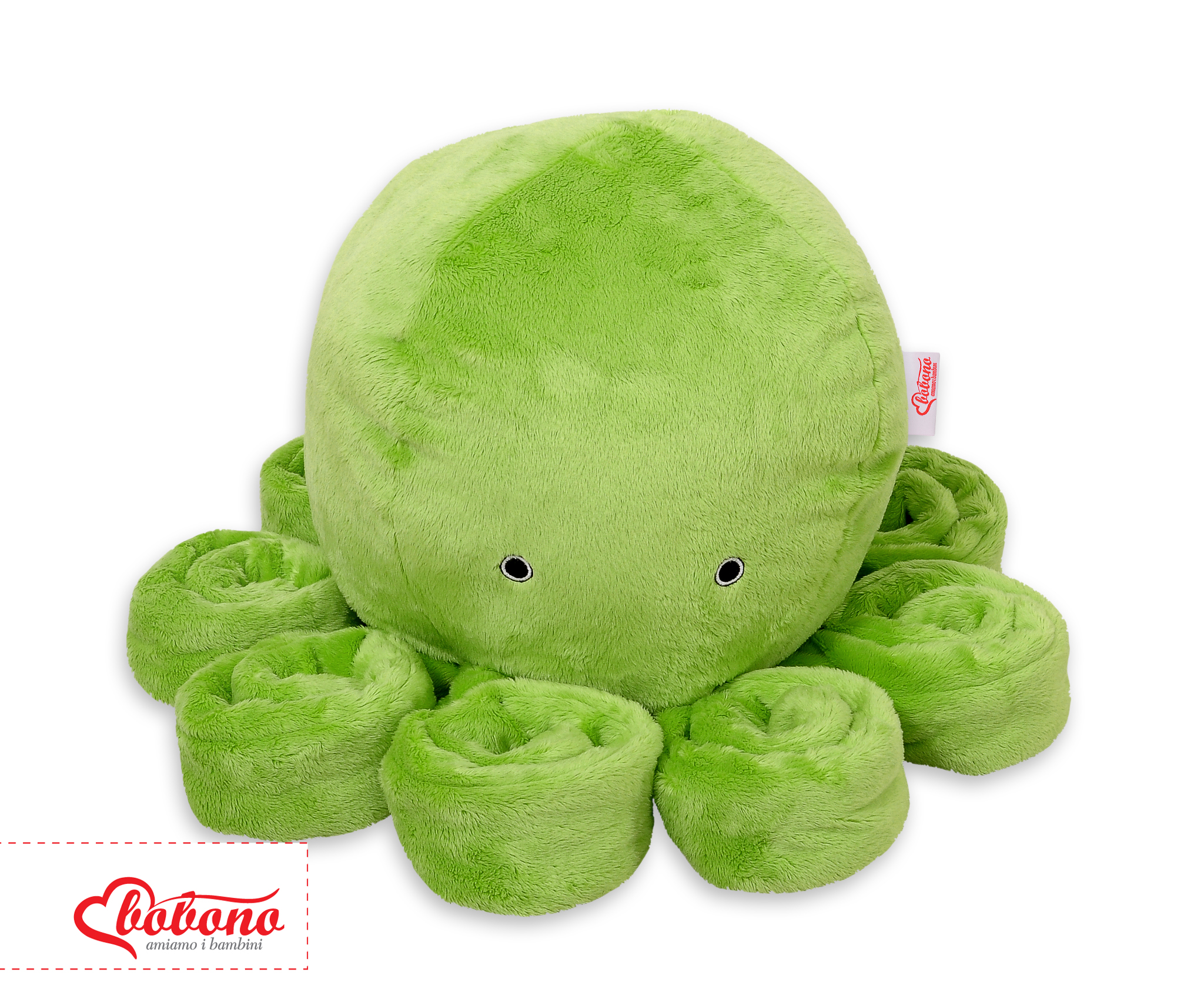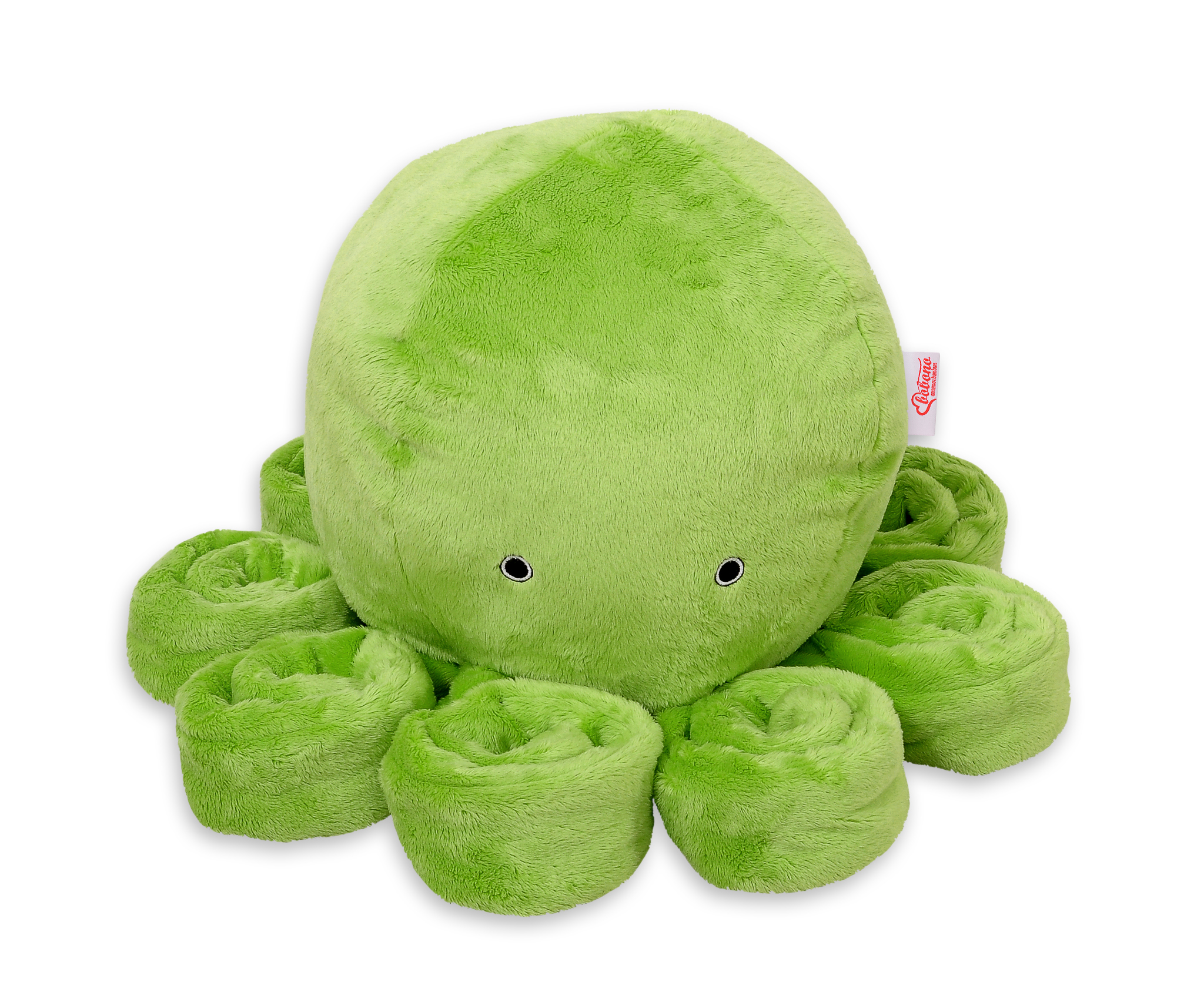 Deze leuke, knuffelige octopus is perfect voor elke baby, om te slapen en te knuffelen. De armen van de octopus zijn comfortabel vast te houden door kleine babyhandjes. De octopus is perfect veilig voor baby's vanaf de geboorte. Met een zacht rammelend geluid trekt het de aandacht van de baby. Gemaakt van zacht aanvoelend, donzig minky fleece. De vulling van het kussen bestaat uit Eco Fillball-gecertificeerde Siliconeballetjes - "kunstmatige dons" voor kussens - de vulling zorgt voor een goede luchtcirculatie en lighouding voor de baby.