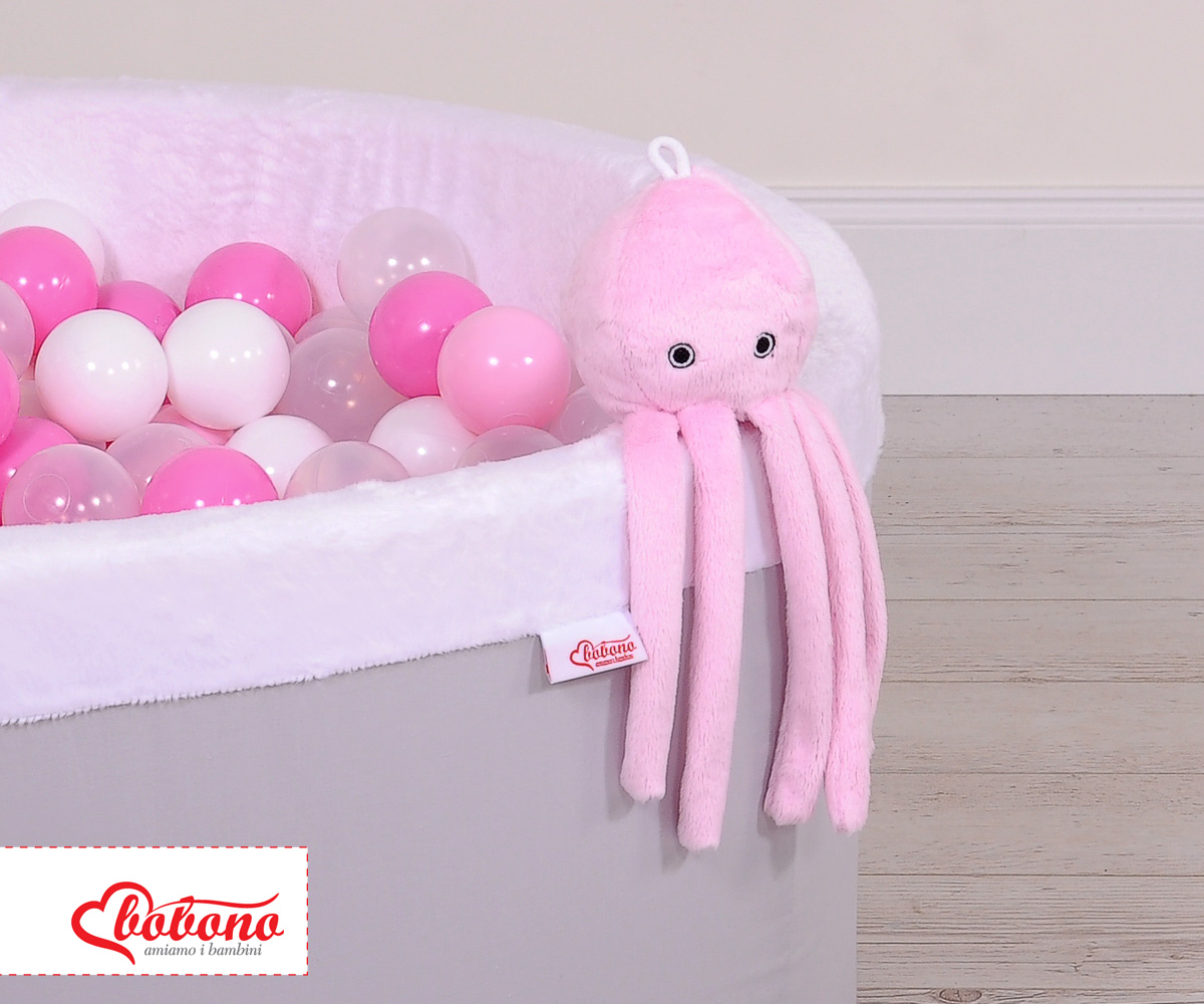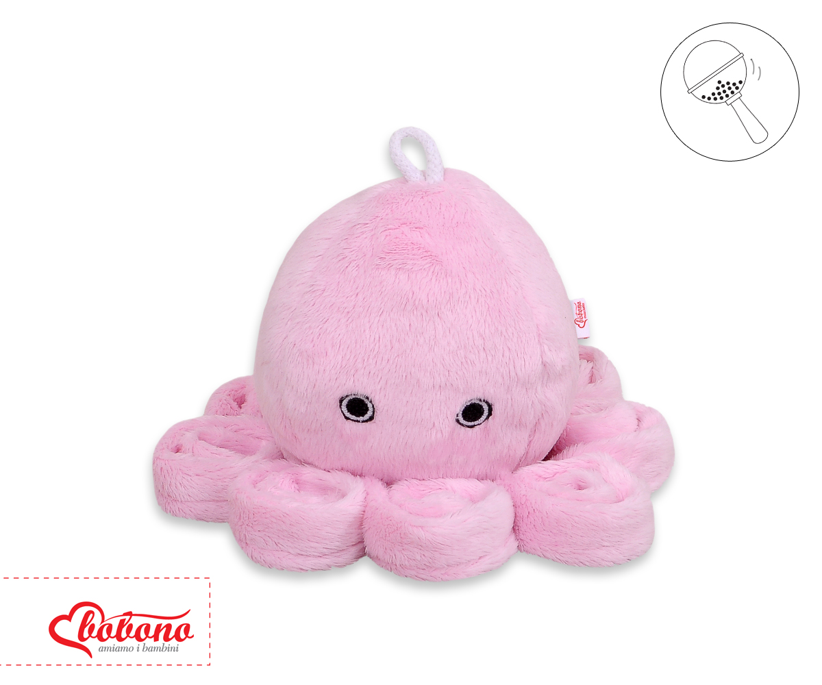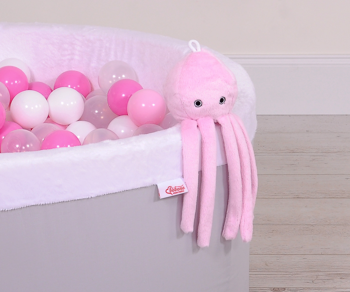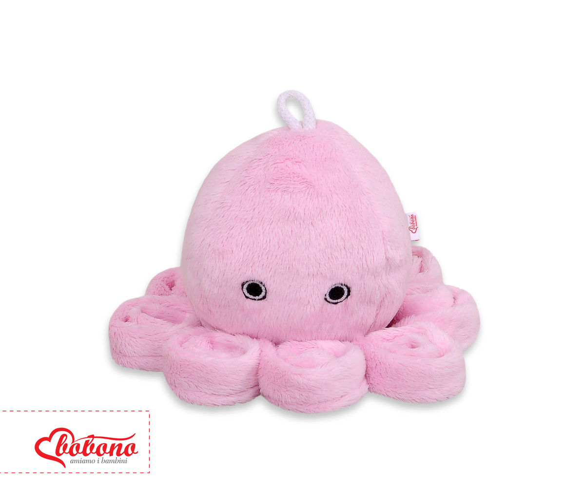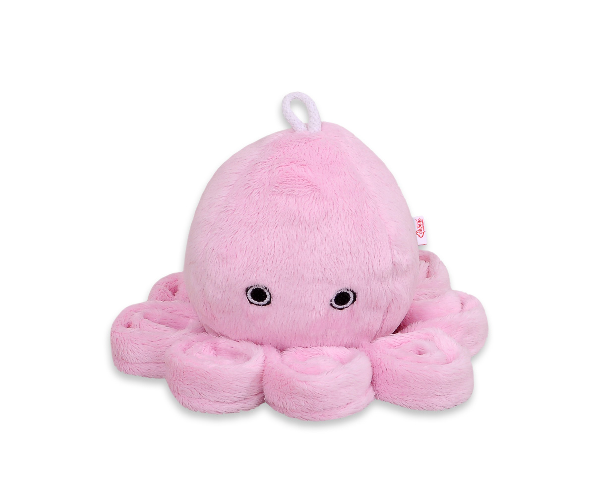 Deze leuke, knuffelige octopus is perfect voor elke baby, om te slapen en te knuffelen. De armen van de octopus zijn comfortabel vast te houden door kleine babyhandjes. De octopus is perfect veilig voor baby's vanaf de geboorte. Met een zacht rammelend geluid trekt het de aandacht van de baby. Gemaakt van zacht aanvoelend, donzig minky fleece. De vulling van het kussen bestaat uit Eco Fillball-gecertificeerde Siliconeballetjes - "kunstmatige dons" voor kussens - de vulling zorgt voor een goede luchtcirculatie en lighouding voor de baby.