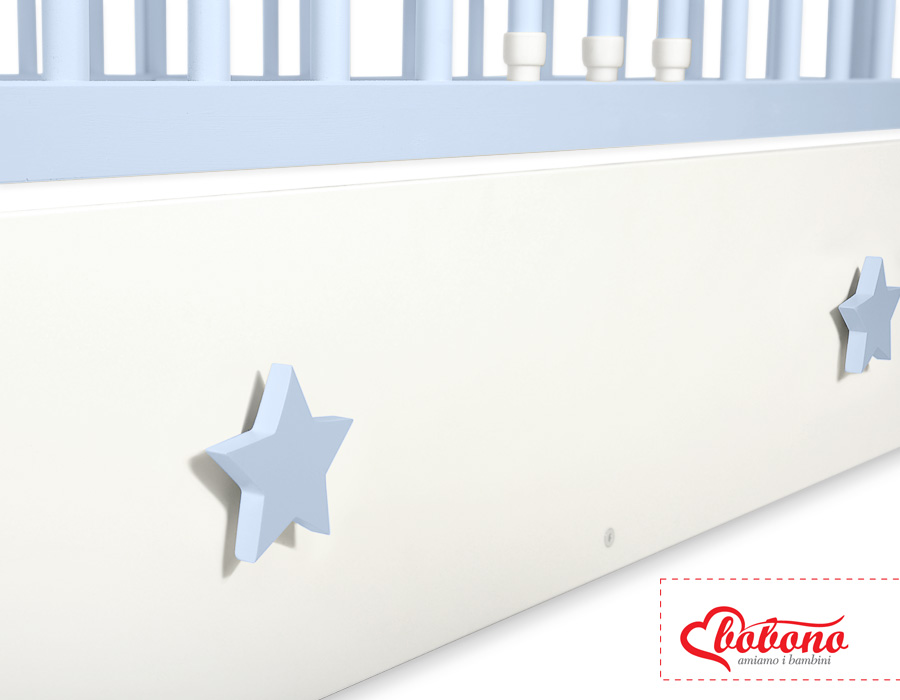 Een lade voor een ledikant van 120x60 cm met decoratieve, handgemaakte handvaten. Biedt meer ruimte voor beddengoed, speelgoed en andere benodigdheden.