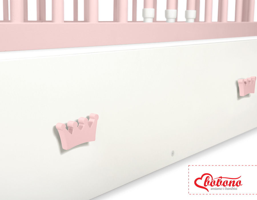 Een lade voor een ledikant van 120x60 cm met decoratieve, handgemaakte handvaten. Biedt meer ruimte voor beddengoed, speelgoed en andere benodigdheden.
