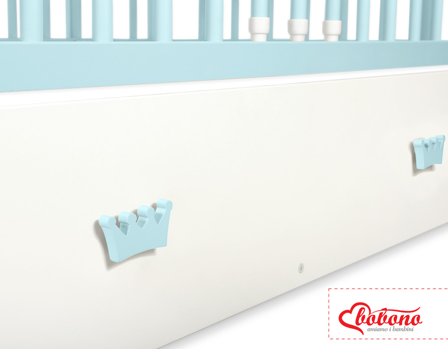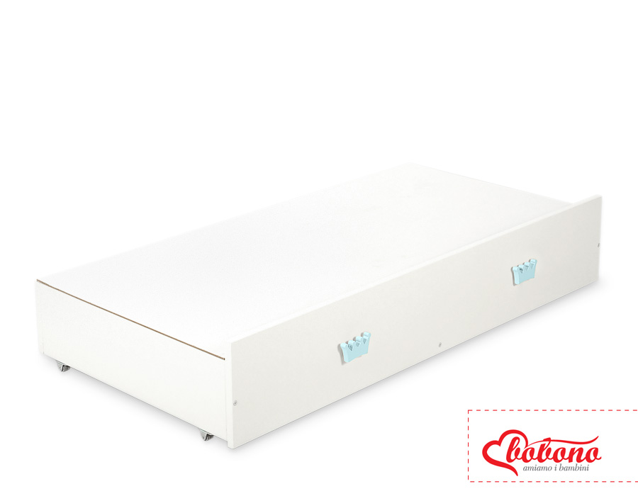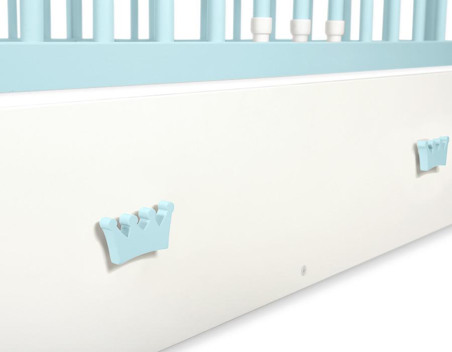 Een lade voor een ledikant van 120x60 cm met decoratieve, handgemaakte handvaten. Biedt meer ruimte voor beddengoed, speelgoed en andere benodigdheden.