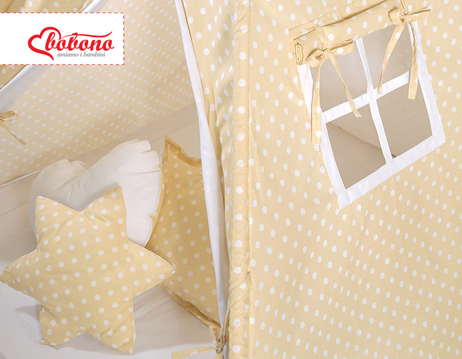 MEGA TIPI SET: Tipi-tent + speelmat + kussens + GRATIS decoratieve veren Beige Polkaprikker