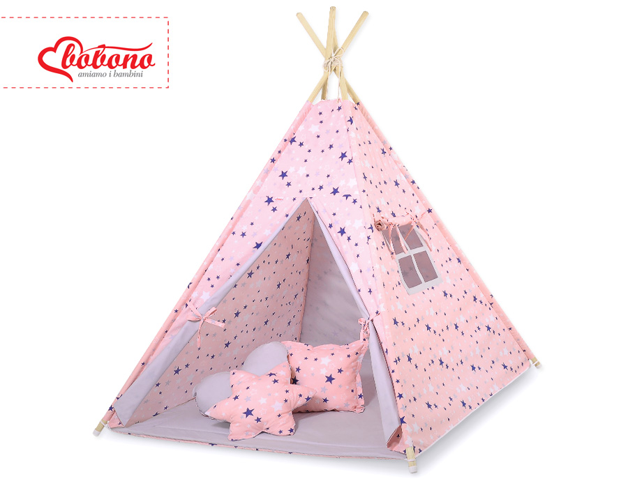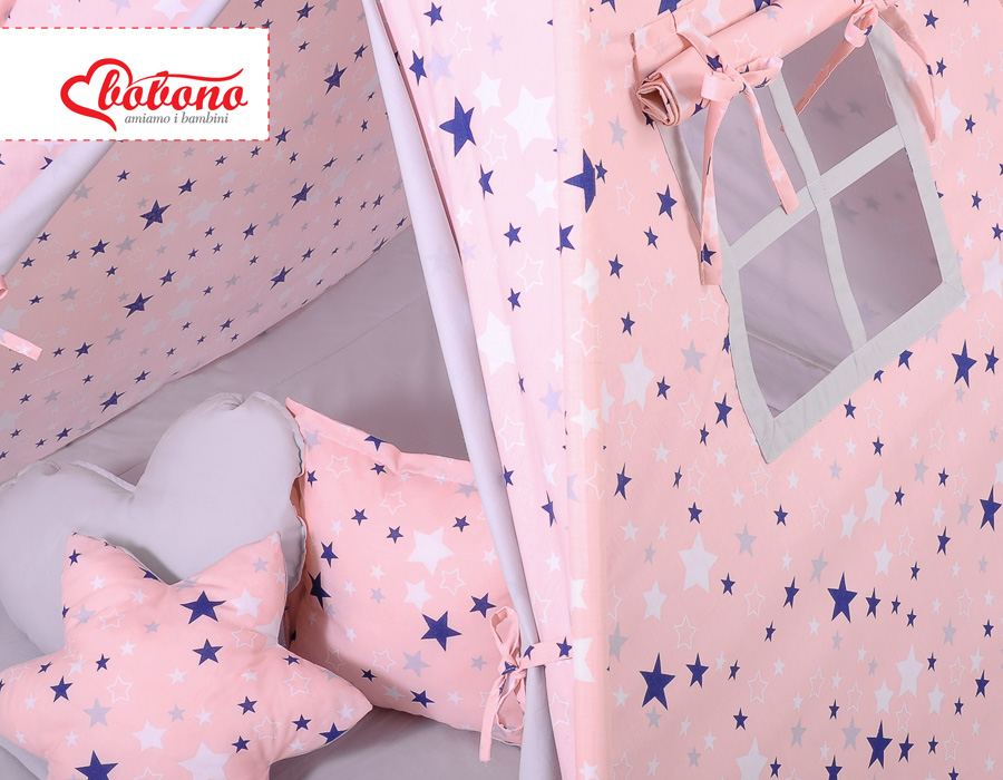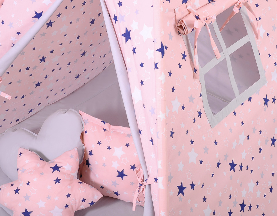Kleinbaby.nl » Speelgoed Knuffels » Tipi-tenten » Mega Set: Tipi-tent + speelmat + kussens » MEGA TIPI SET: Tipi-tent + speelmat + kussens + GRATIS decoratieve veren Blauw Roze Grijs Sterren
