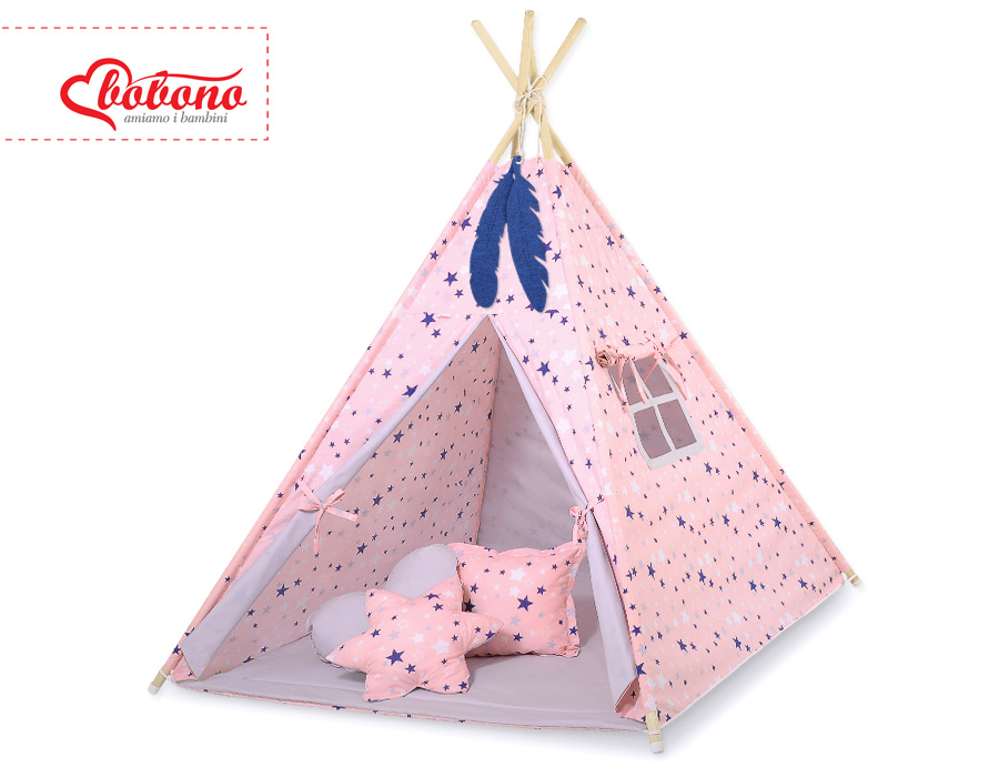 MEGA TIPI SET: Tipi-tent + speelmat + kussens + GRATIS decoratieve veren Blauw Roze Grijs Sterren
