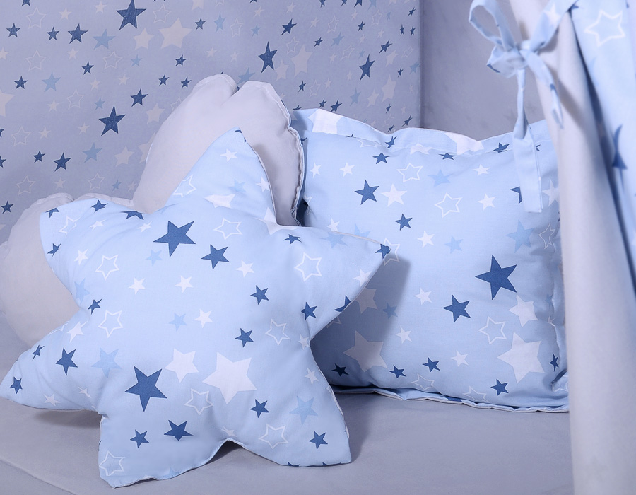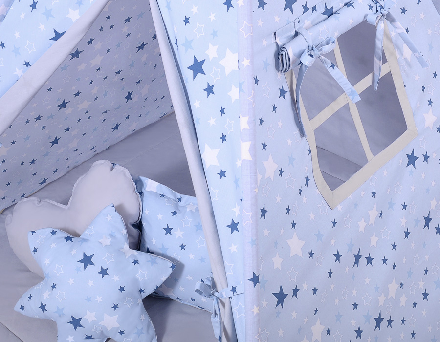 Kleinbaby.nl » Speelgoed Knuffels » Tipi-tenten » Mega Set: Tipi-tent + speelmat + kussens » MEGA TIPI SET: Tipi-tent + speelmat + kussens + GRATIS decoratieve veren Blauw Sterren
