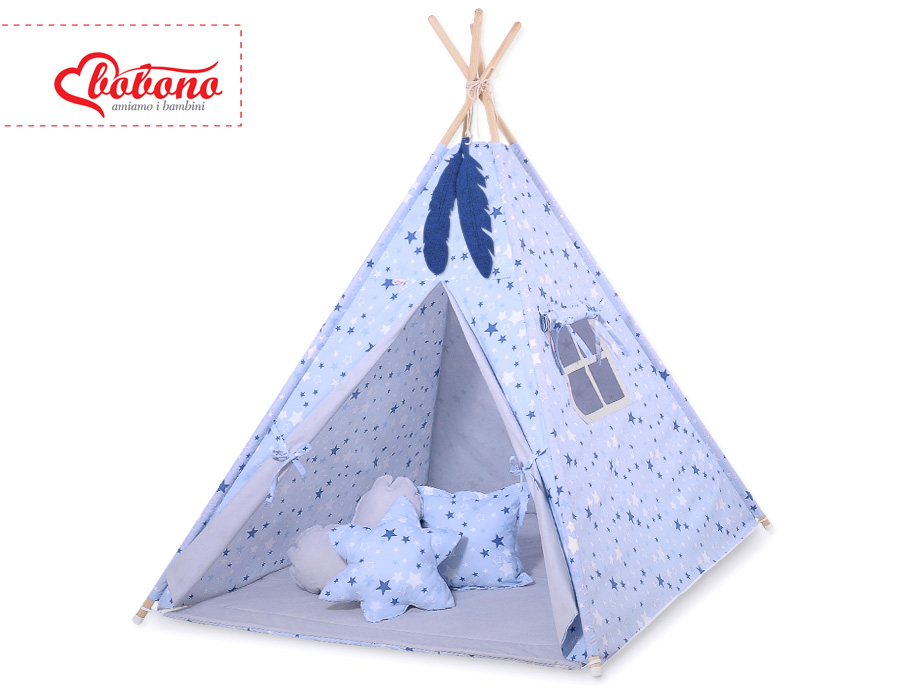 MEGA TIPI SET: Tipi-tent + speelmat + kussens + GRATIS decoratieve veren Blauw Sterren