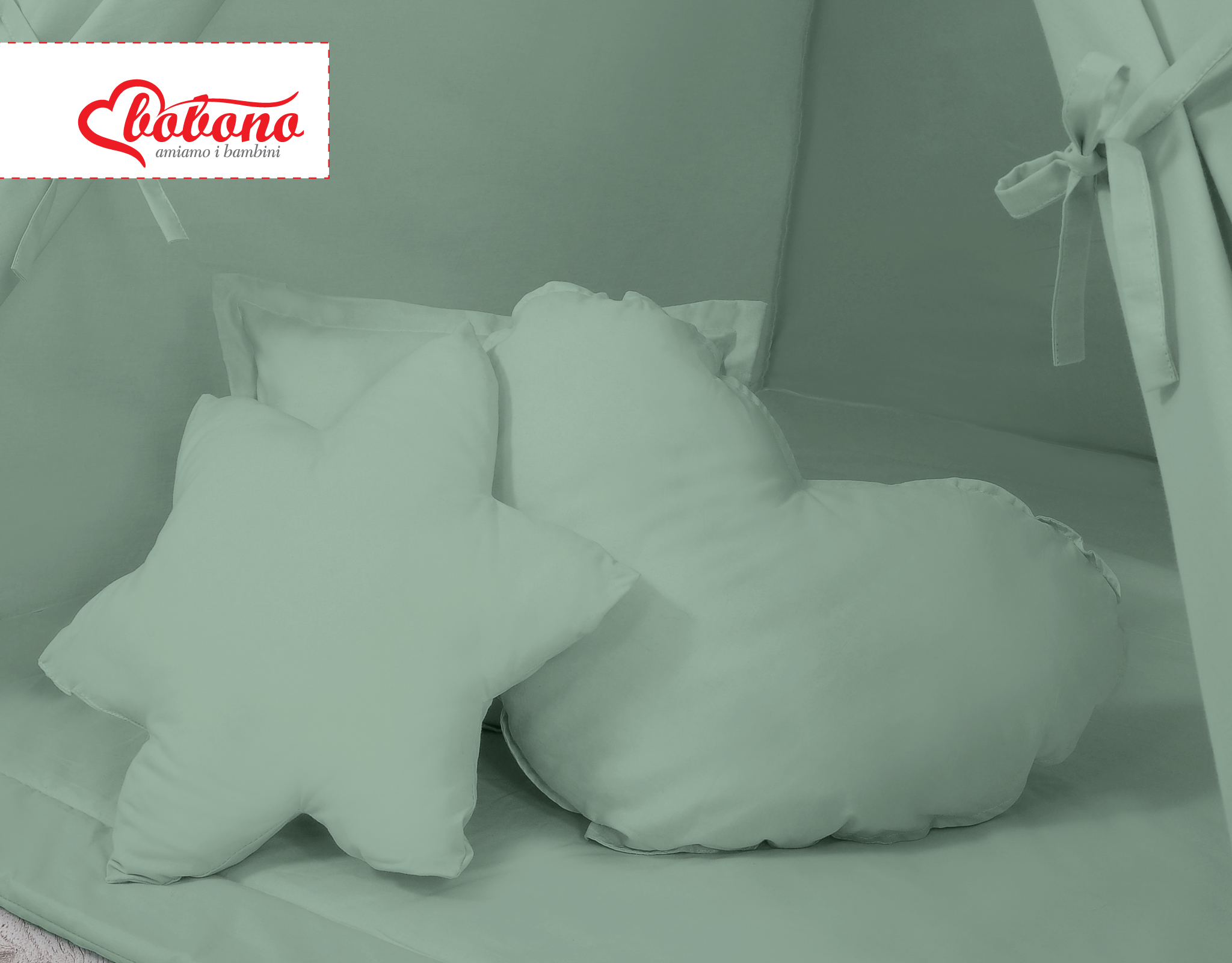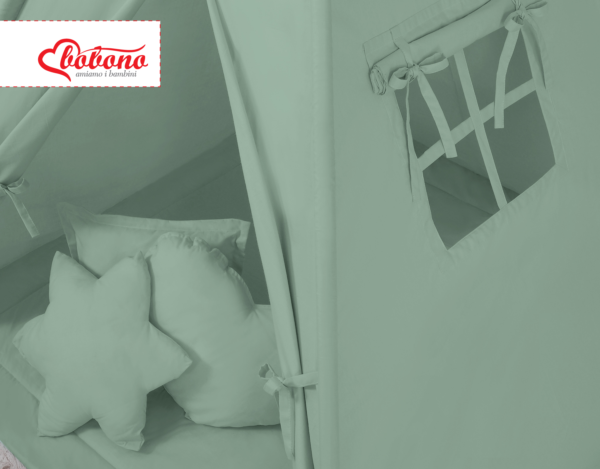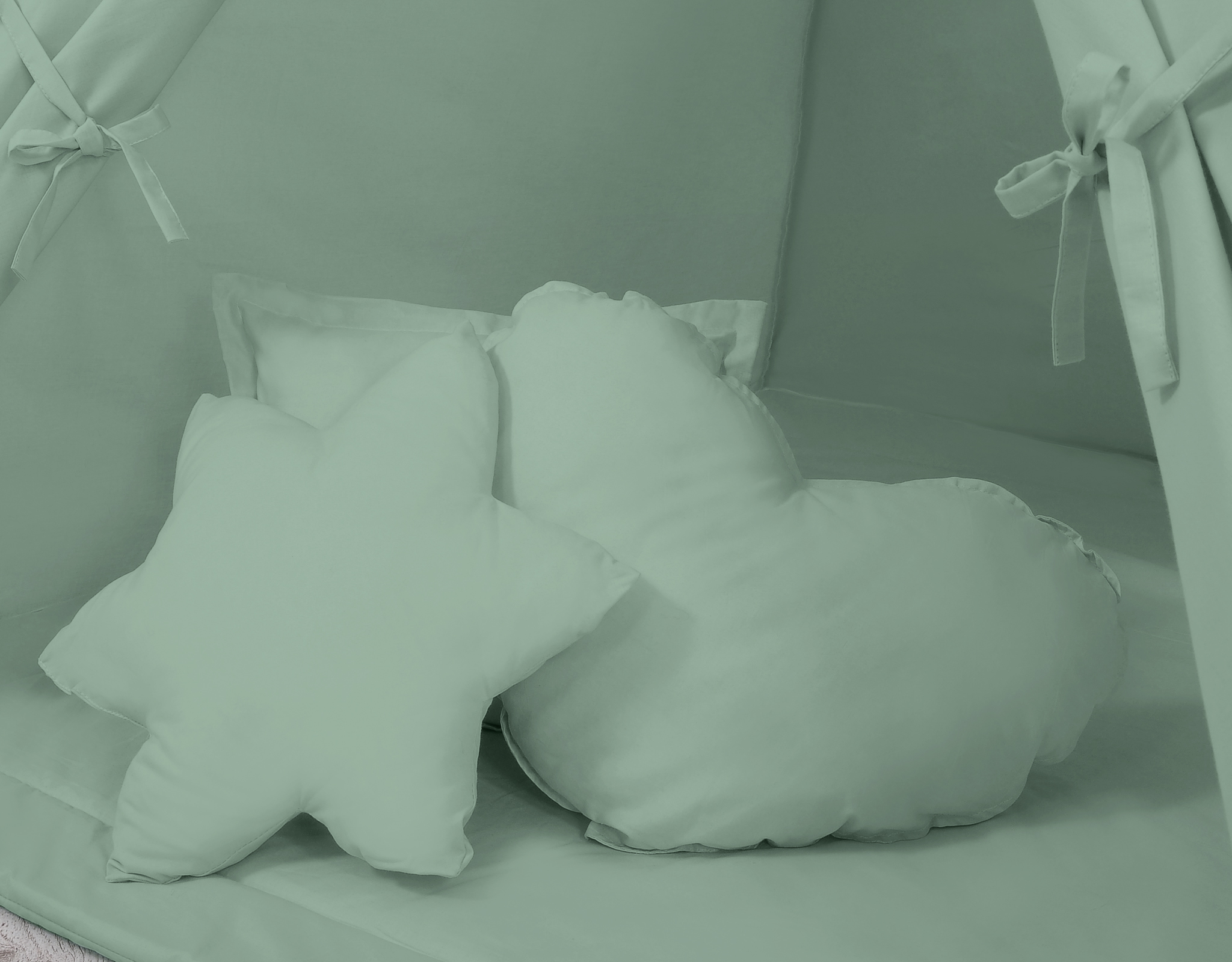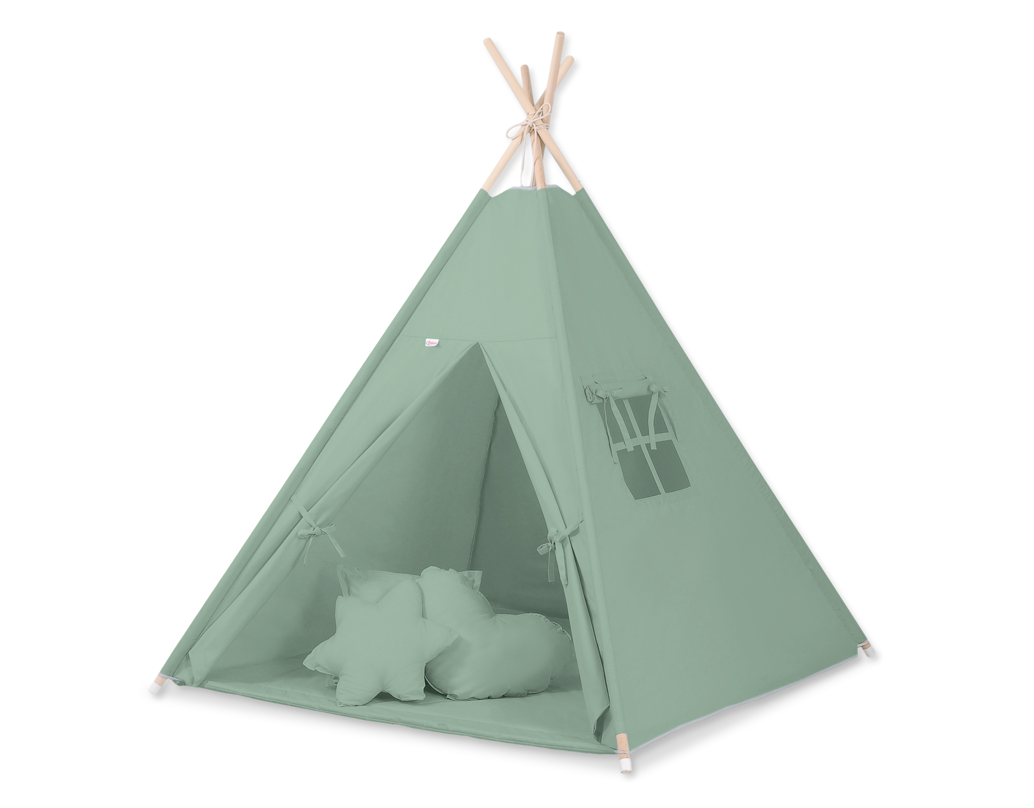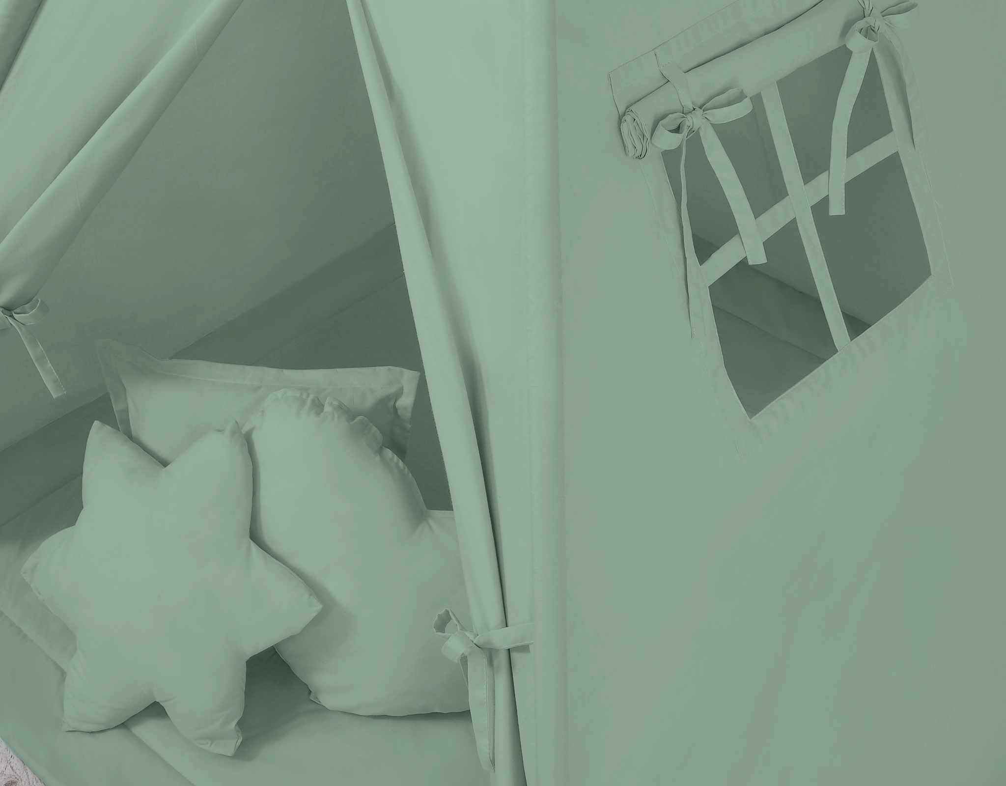 Kleinbaby.nl » Speelgoed Knuffels » Tipi-tenten » Mega Set: Tipi-tent + speelmat + kussens » MEGA TIPI SET: Tipi-tent + speelmat + kussens + GRATIS decoratieve veren Pastelgroen