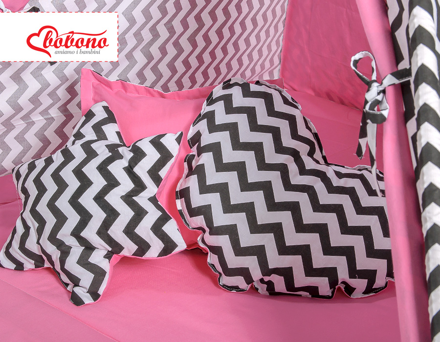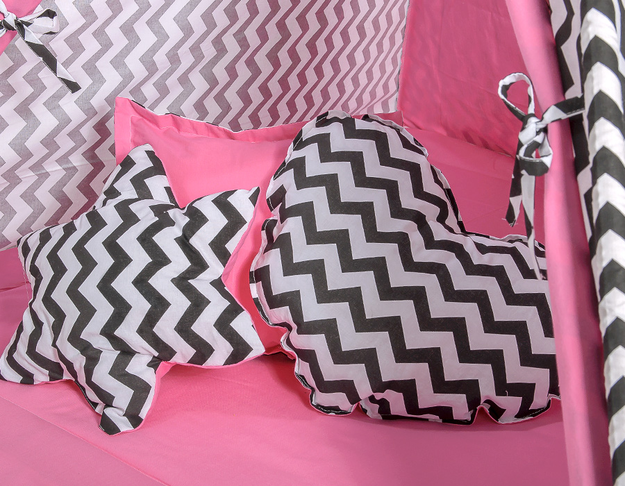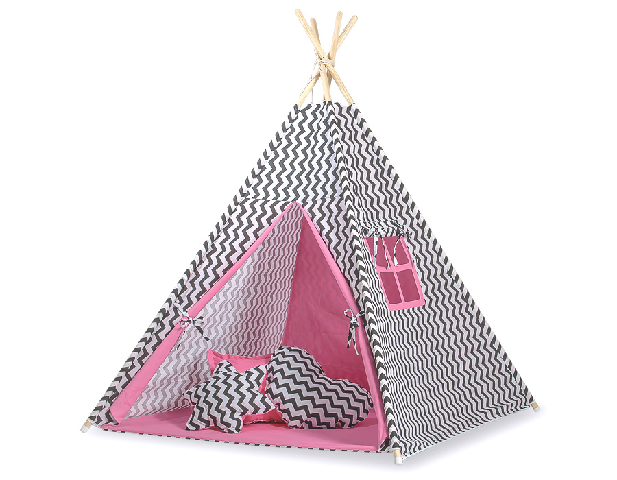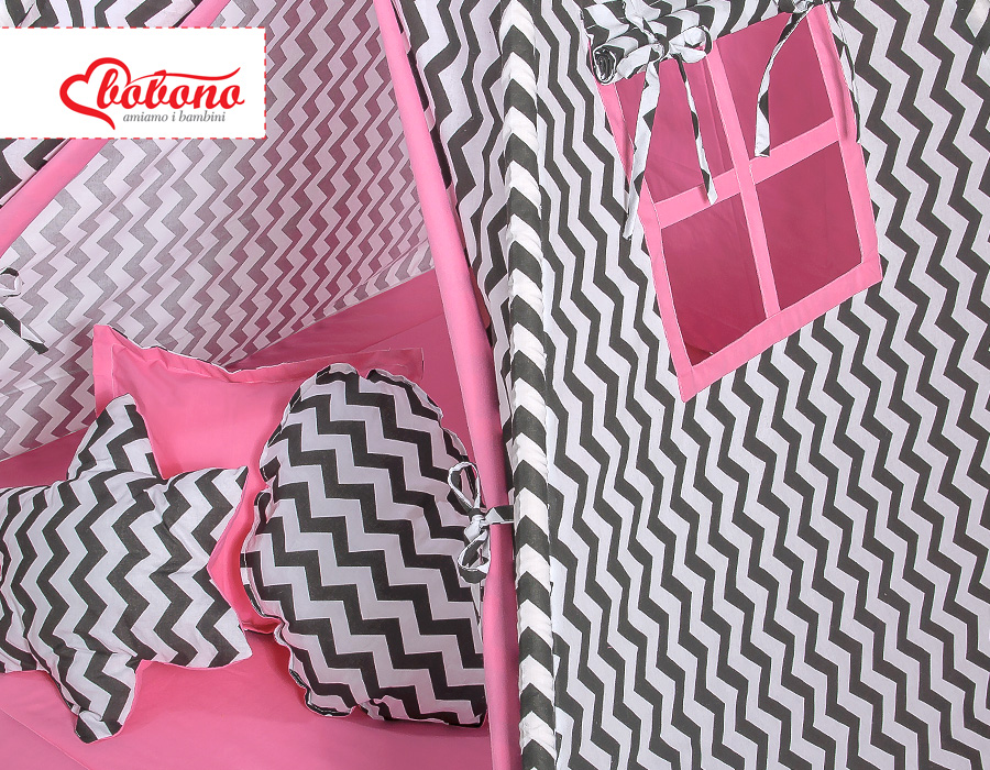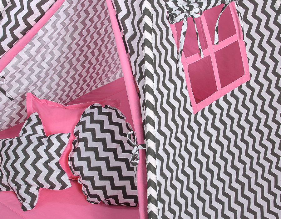 Kleinbaby.nl » Speelgoed Knuffels » Tipi-tenten » Mega Set: Tipi-tent + speelmat + kussens » MEGA TIPI SET: Tipi-tent + speelmat + kussens + GRATIS decoratieve veren Roze Zwart Zigzag
