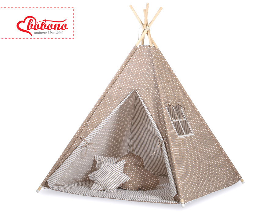 Kleinbaby.nl » Speelgoed Knuffels » Tipi-tenten » Set Tipi-tent met Speelmat » MINI TIPI SET: Tipi-tent + speelmat + GRATIS decoratieve veren Bruin Beige Polkaprikker
