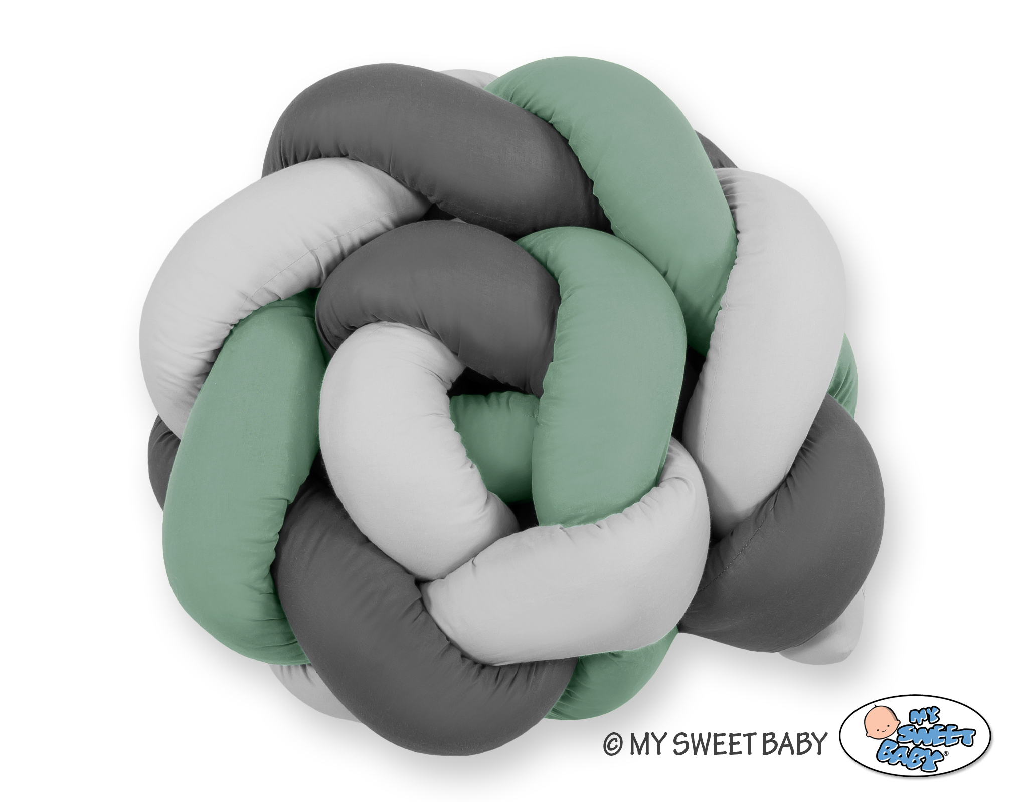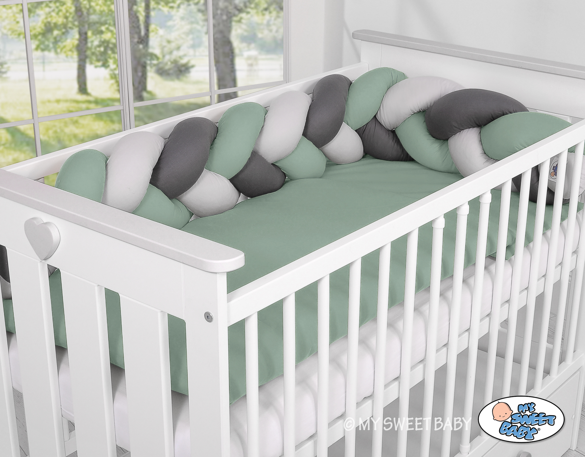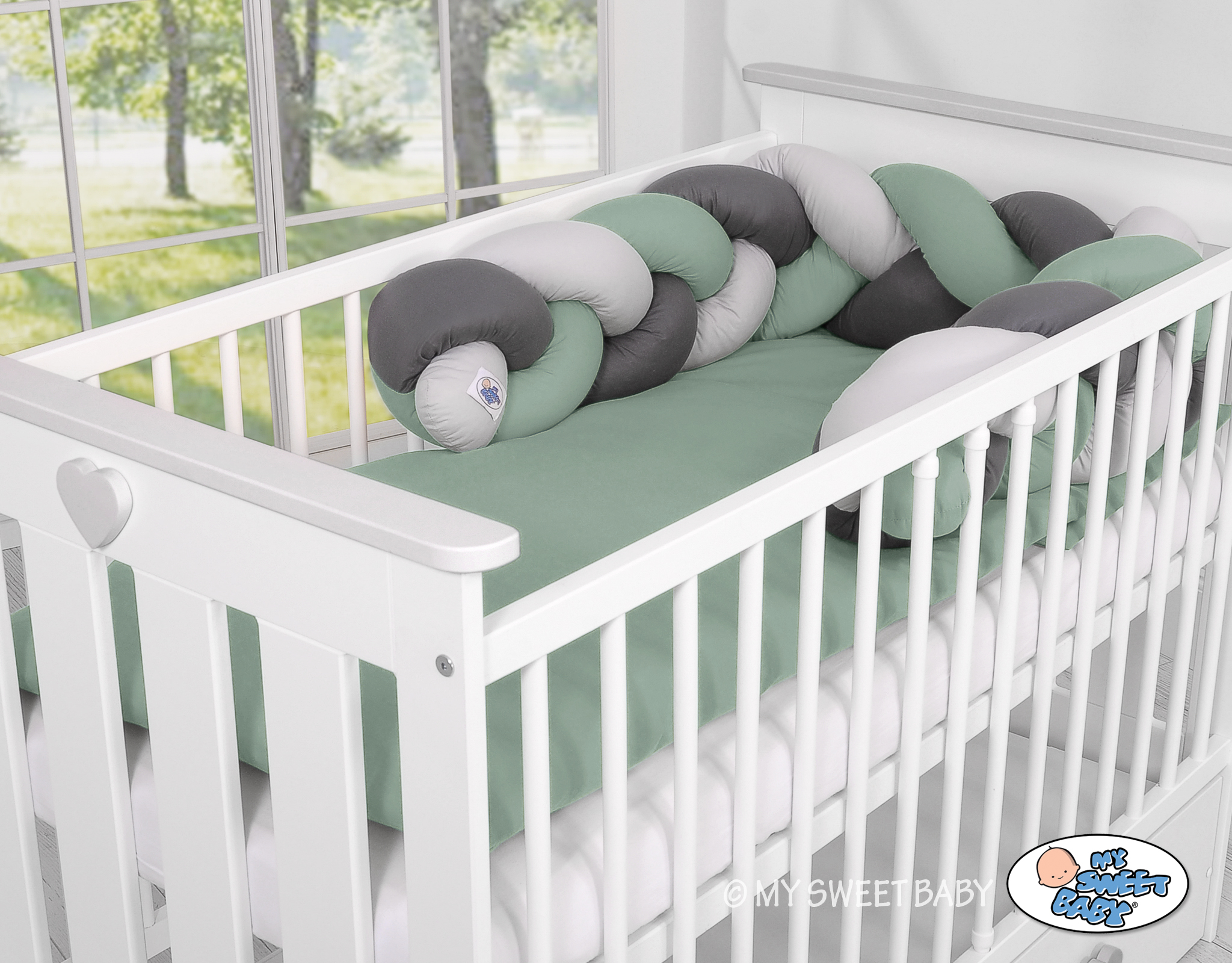 Kleinbaby.nl » Gevlochten Collectie » Gevlochten Bedomrander » My Sweet Baby Gevlochten Bedbumper voor Babybed 180 cm Grijs Pastelgroen Antraciet