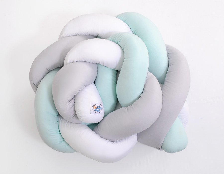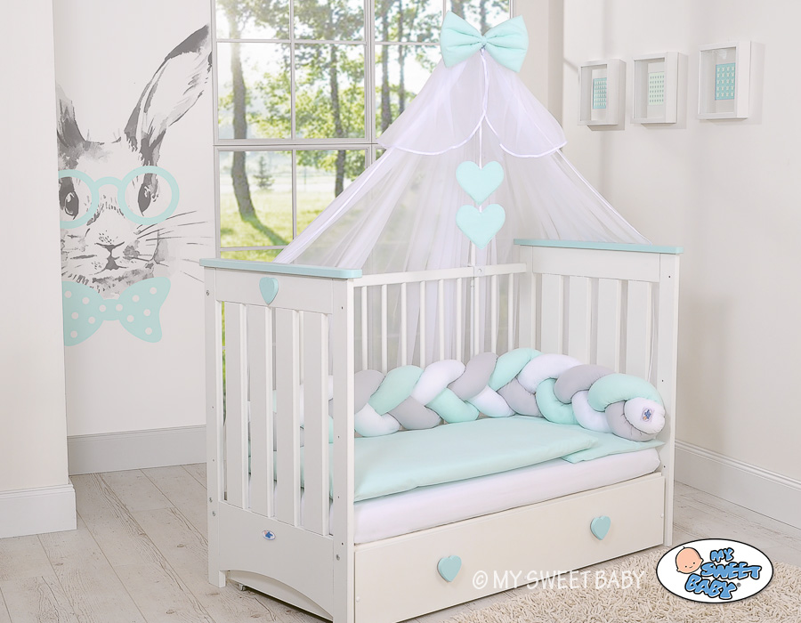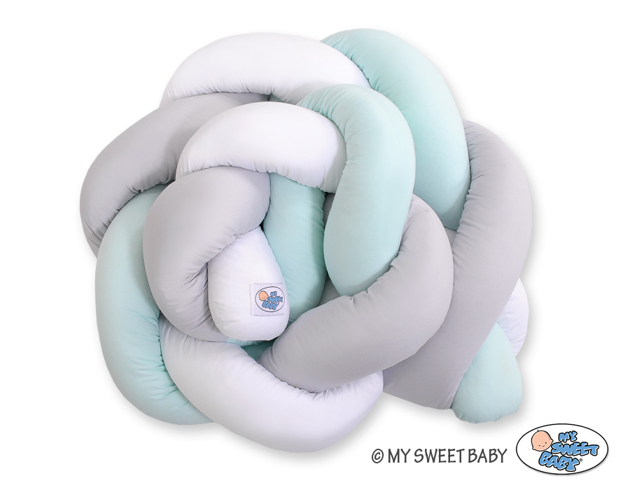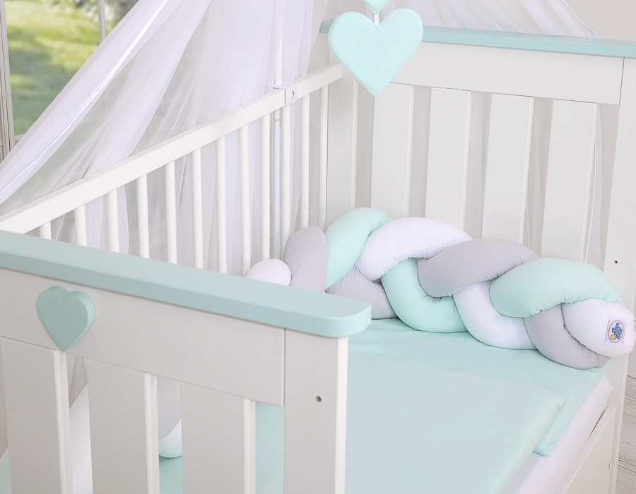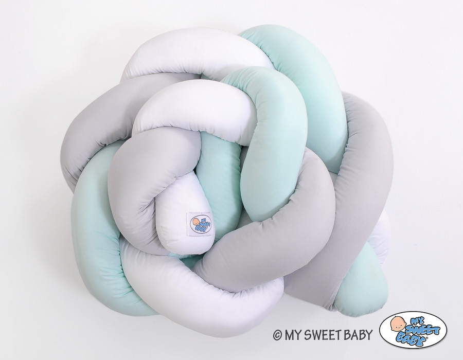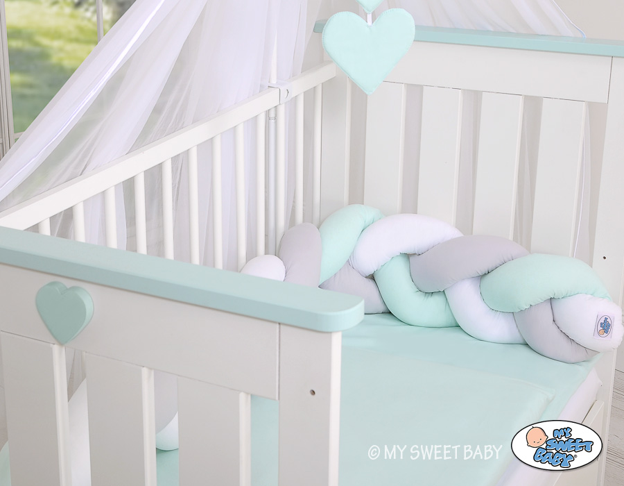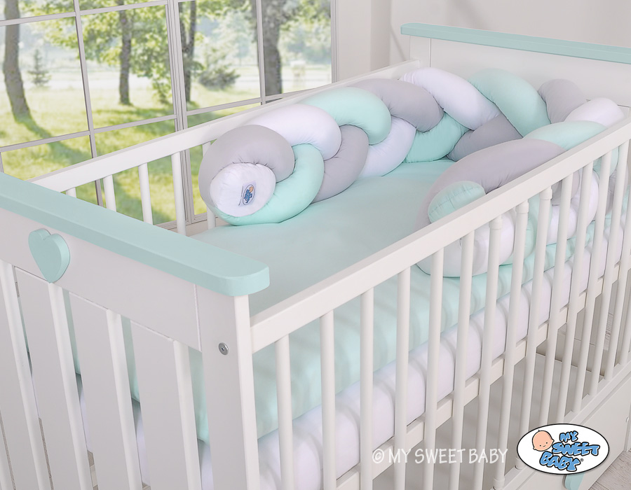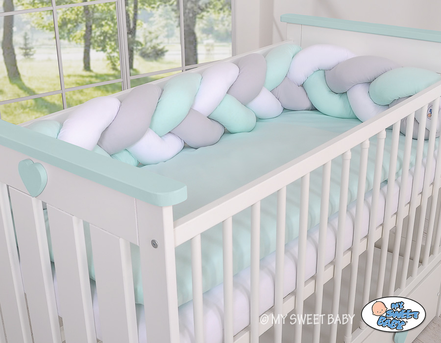 Kleinbaby.nl » Gevlochten Collectie » Gevlochten Bedomrander » My Sweet Baby Gevlochten Bedbumper voor Babybed 180 cm Mint Wit Grijs