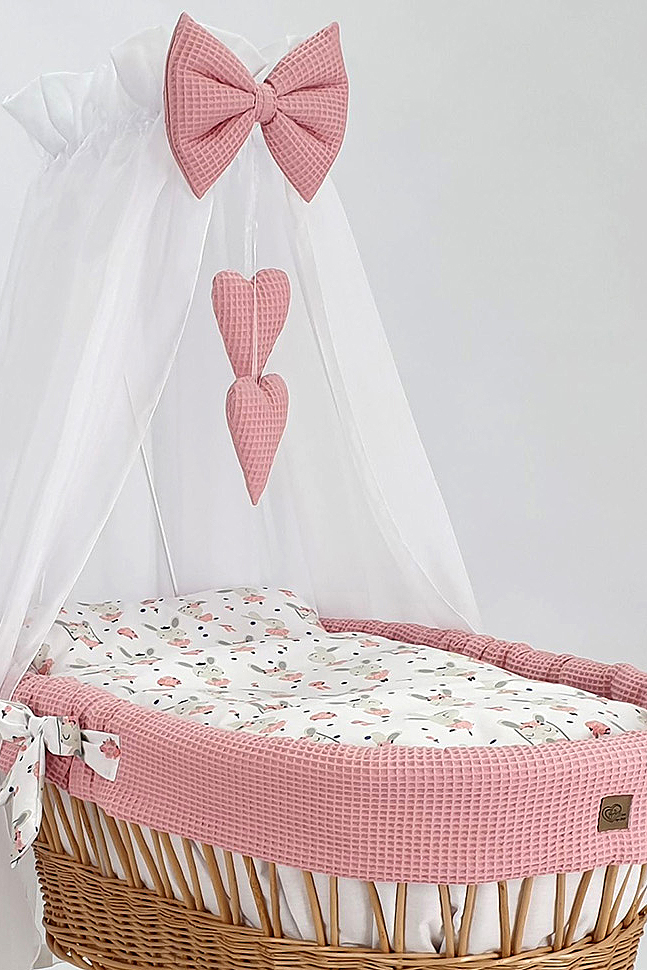 Kleur van het beddengoed: poederroze wafelstof met witte katoen en print van konijntjes