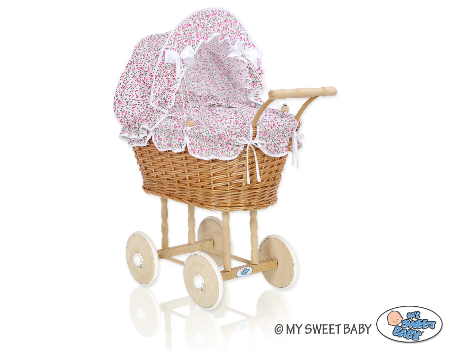 Kleinbaby.nl » Speelgoed Knuffels » Poppenwagens en Speelgoed » Poppenwagen van Riet » Poppenwagen Natuurlijke versie » Natuurlijke Poppenwagen van Riet Roze Bloemenweide Bloemen