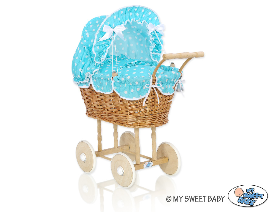 Kleinbaby.nl » Speelgoed Knuffels » Poppenwagens en Speelgoed » Poppenwagen van Riet » Poppenwagen Natuurlijke versie » Natuurlijke Rieten Poppenwagen Turkoois Polkaprikker
