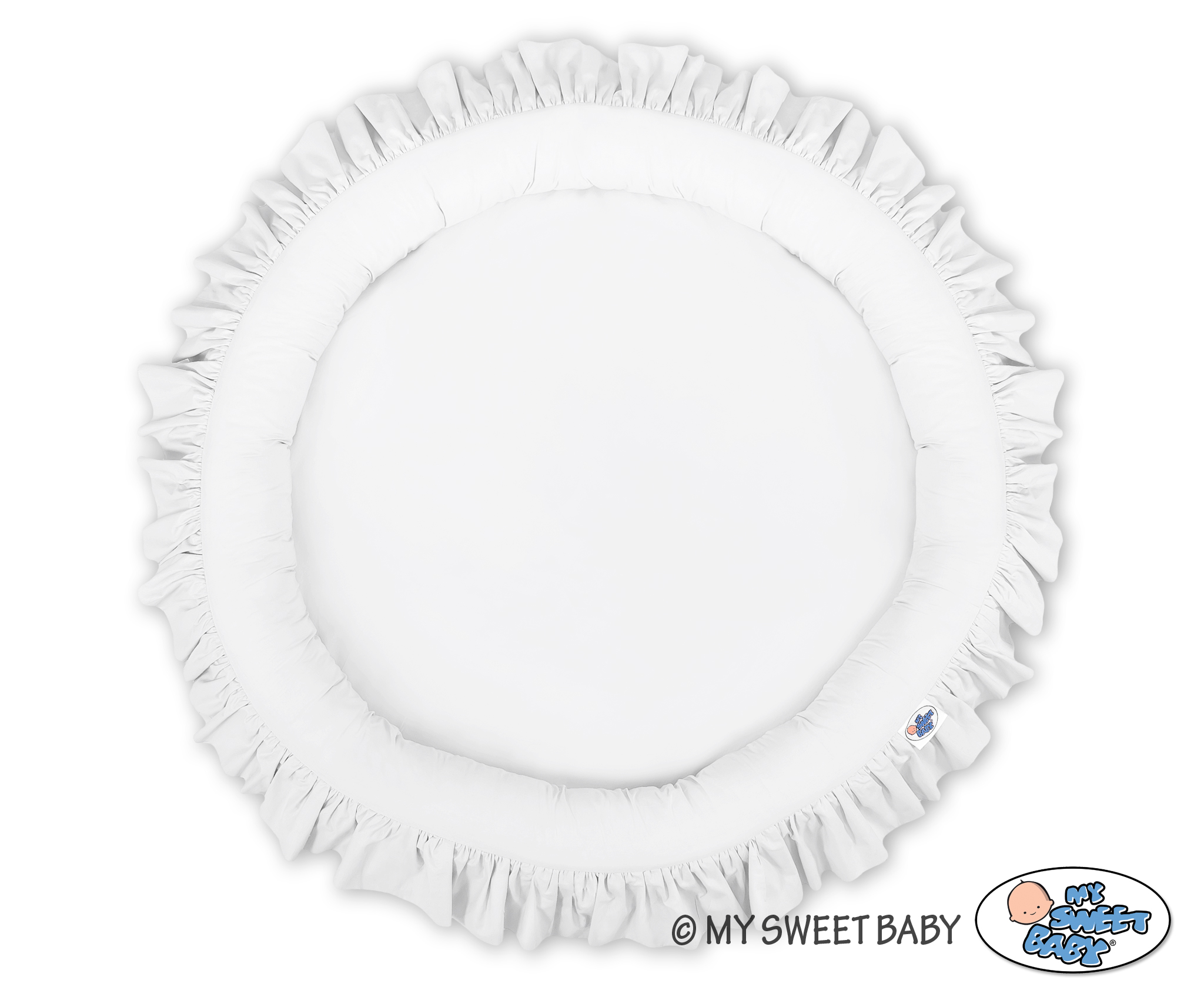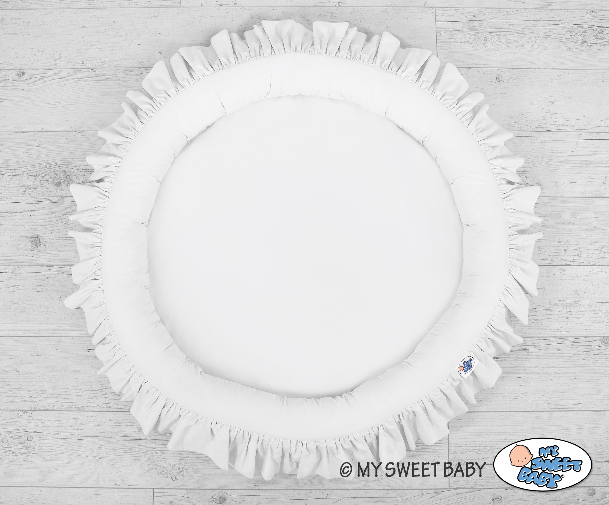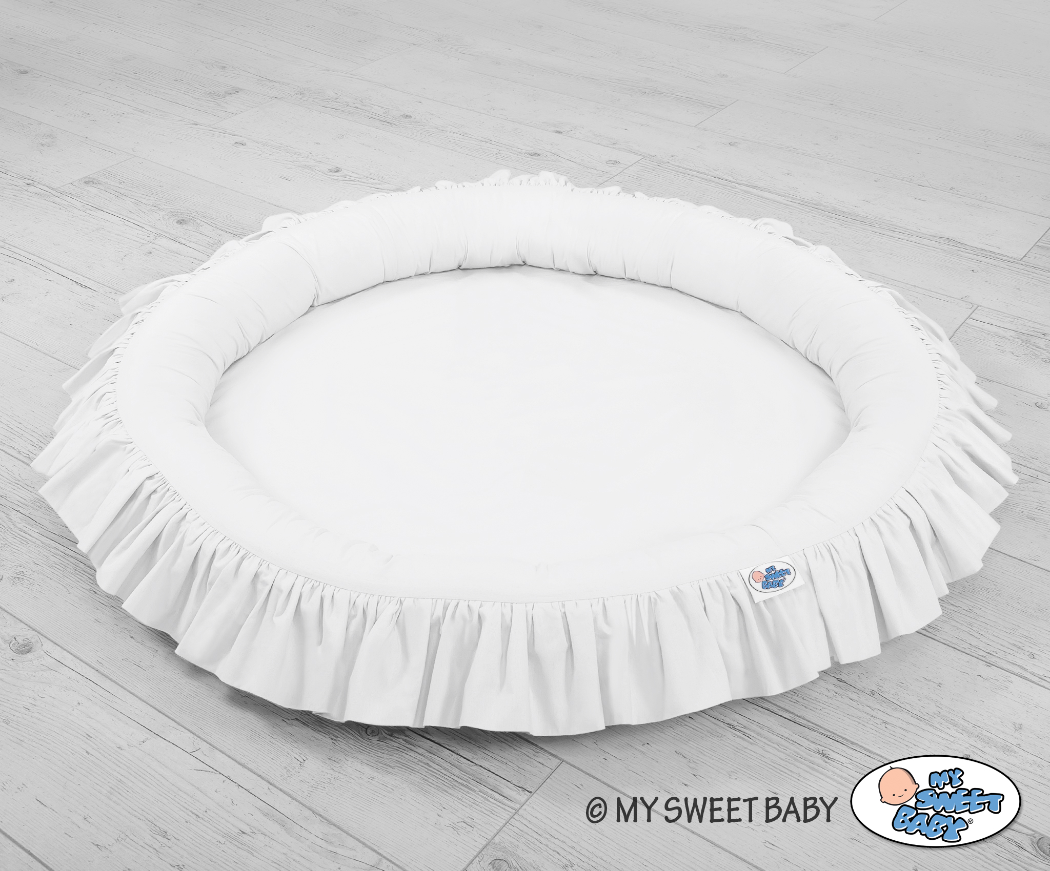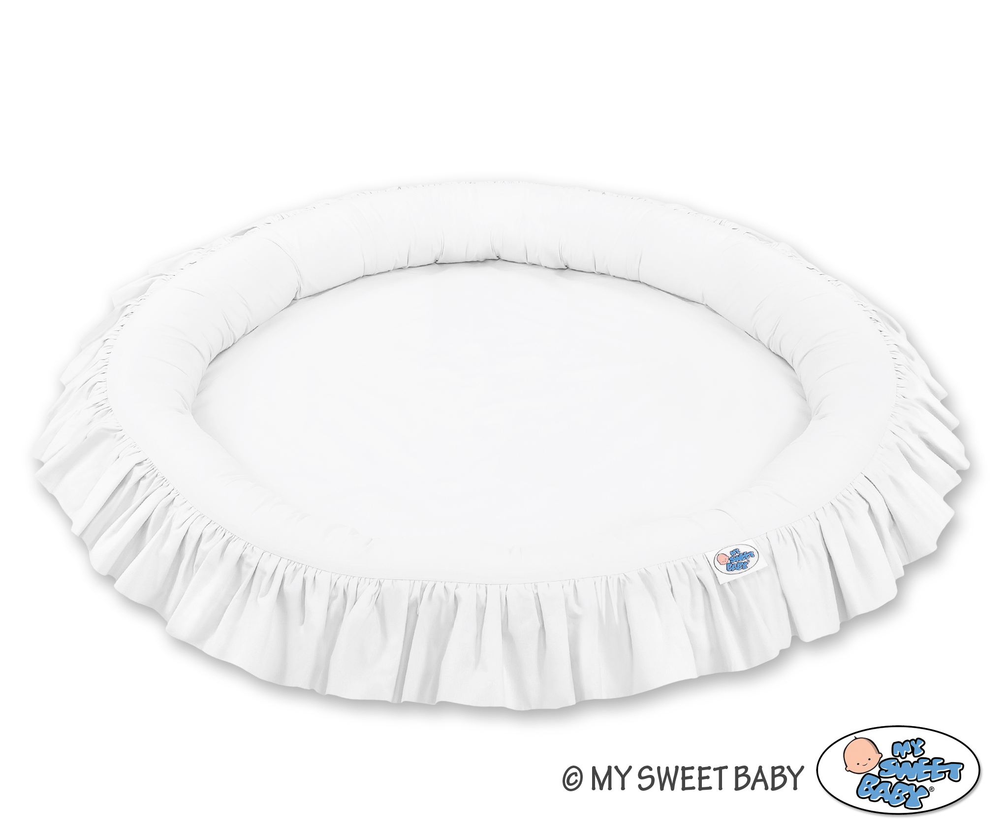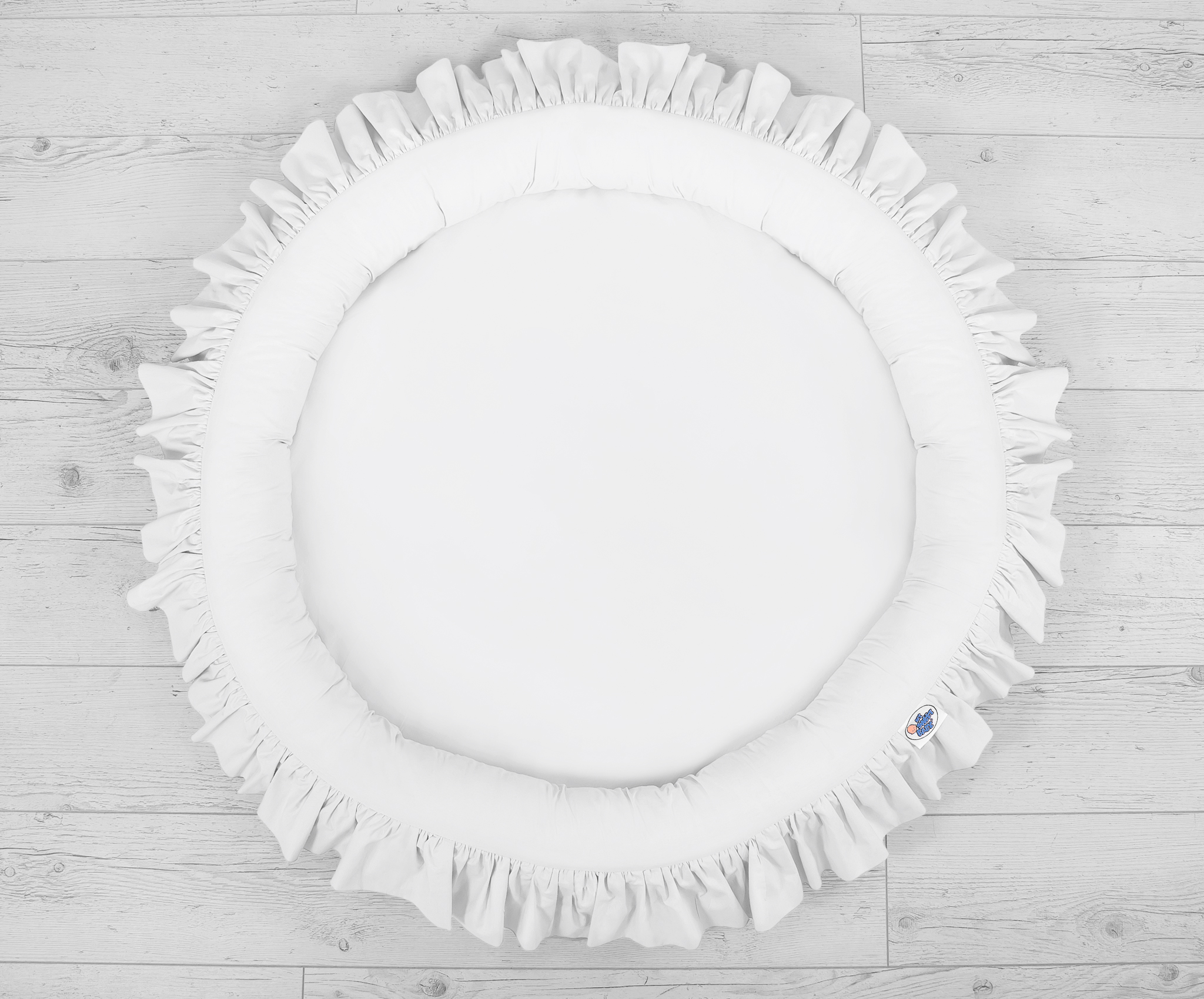 Prachtig nest met een volant. Een functioneel en praktisch nest om in te spelen. Het nest is ideaal als een plaats om te spelen, of als een vloernest onder de katoenen luifel. Het nest met volant kan vanaf de geboorte gebruikt worden als een veilige rustplaats. De zachte randen bieden een veilige omgeving voor de baby. Het is perfect als speelplek met speelgoed. In combinatie met de katoenen luifel creëert het nest een prachtige speeltent.