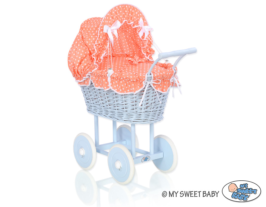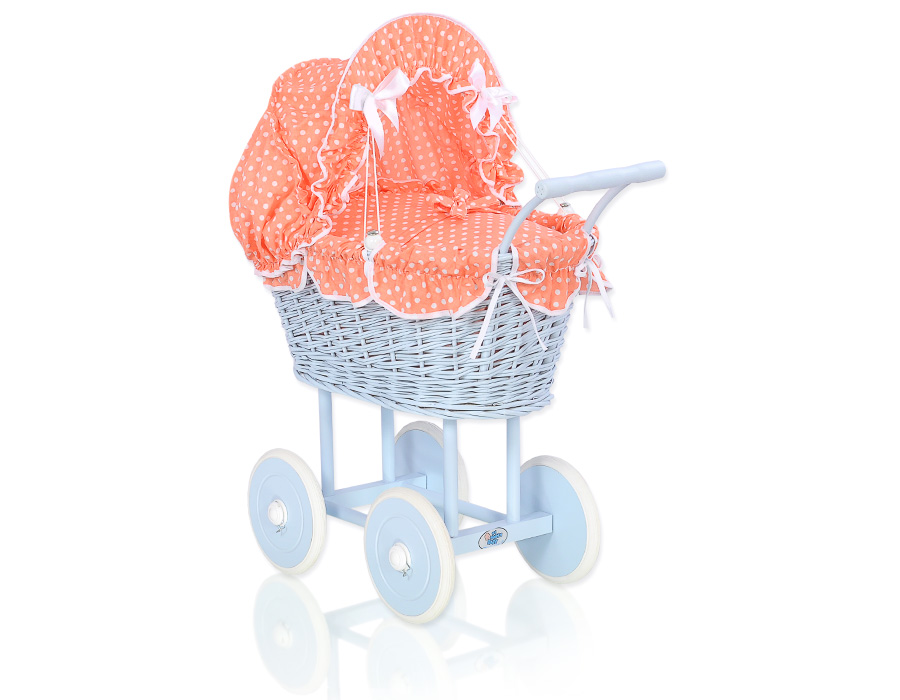 Kleinbaby.nl » Speelgoed Knuffels » Poppenwagens en Speelgoed » Poppenwagen van Riet » Rieten Poppenwagens Blauw » Poppenwagen riet met kap Blauw Polkaprikker Perzik