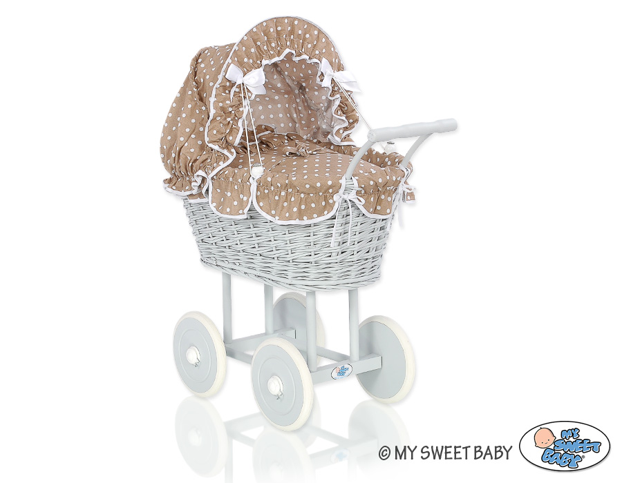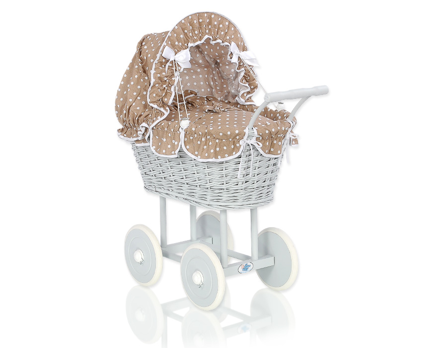 Kleinbaby.nl » Speelgoed Knuffels » Poppenwagens en Speelgoed » Poppenwagen van Riet » Poppenwagen Riet Grijs » Poppenwagen riet met kap Bruin Grijs Polkaprikker