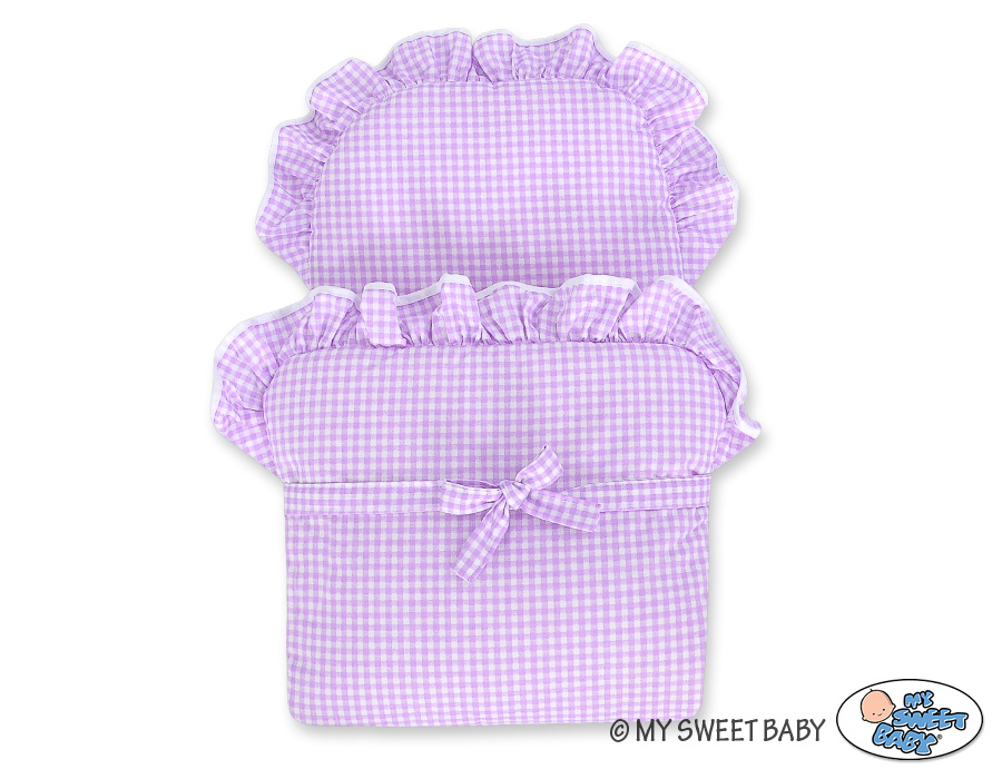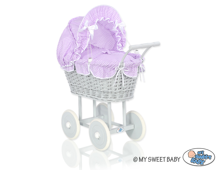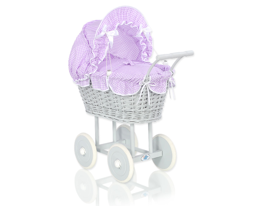 Kleinbaby.nl » Speelgoed Knuffels » Poppenwagens en Speelgoed » Poppenwagen van Riet » Poppenwagen Riet Grijs » Poppenwagen riet met kap Grijs Purper Geruit