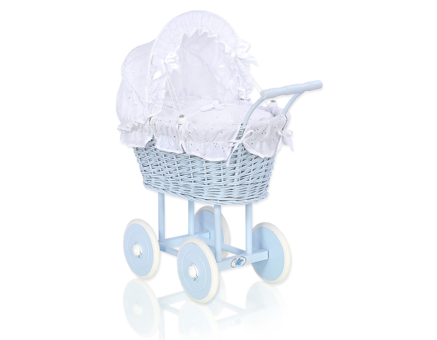 Kleinbaby.nl » Speelgoed Knuffels » Poppenwagens en Speelgoed » Poppenwagen van Riet » Rieten Poppenwagens Blauw » Poppenwagen riet met kap Wit Blauw