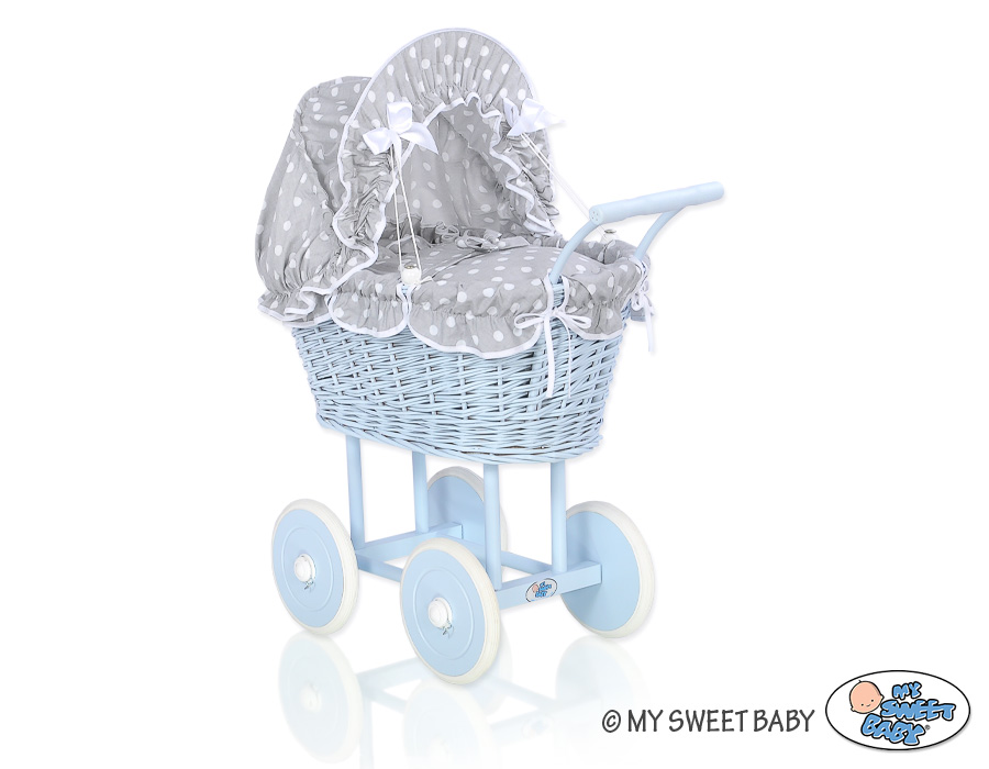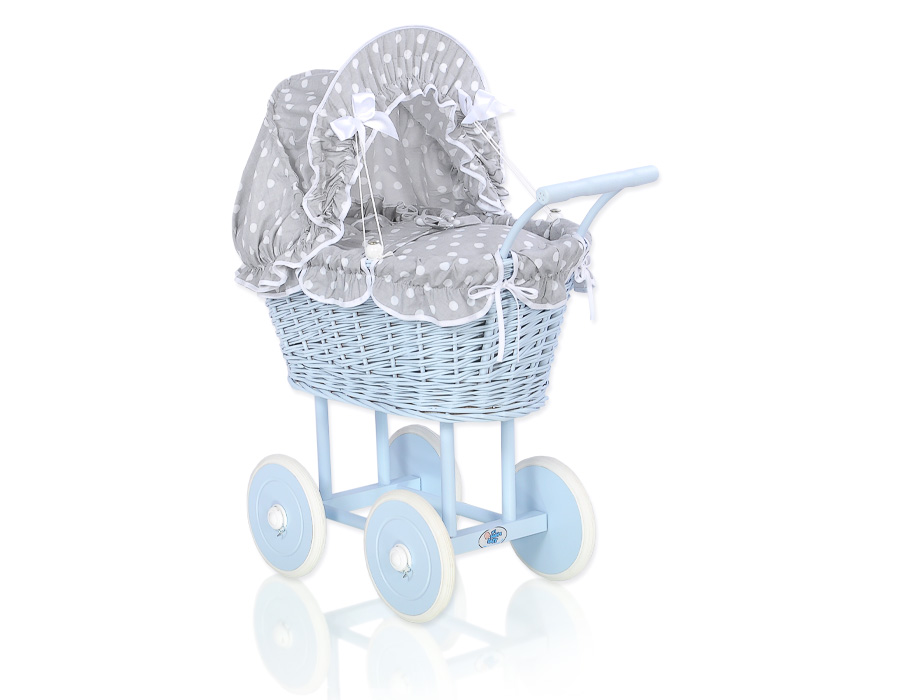 Kleinbaby.nl » Speelgoed Knuffels » Poppenwagens en Speelgoed » Poppenwagen van Riet » Rieten Poppenwagens Blauw » Poppenwagen riet met kap Wit Grijs Blauw Polkaprikker
