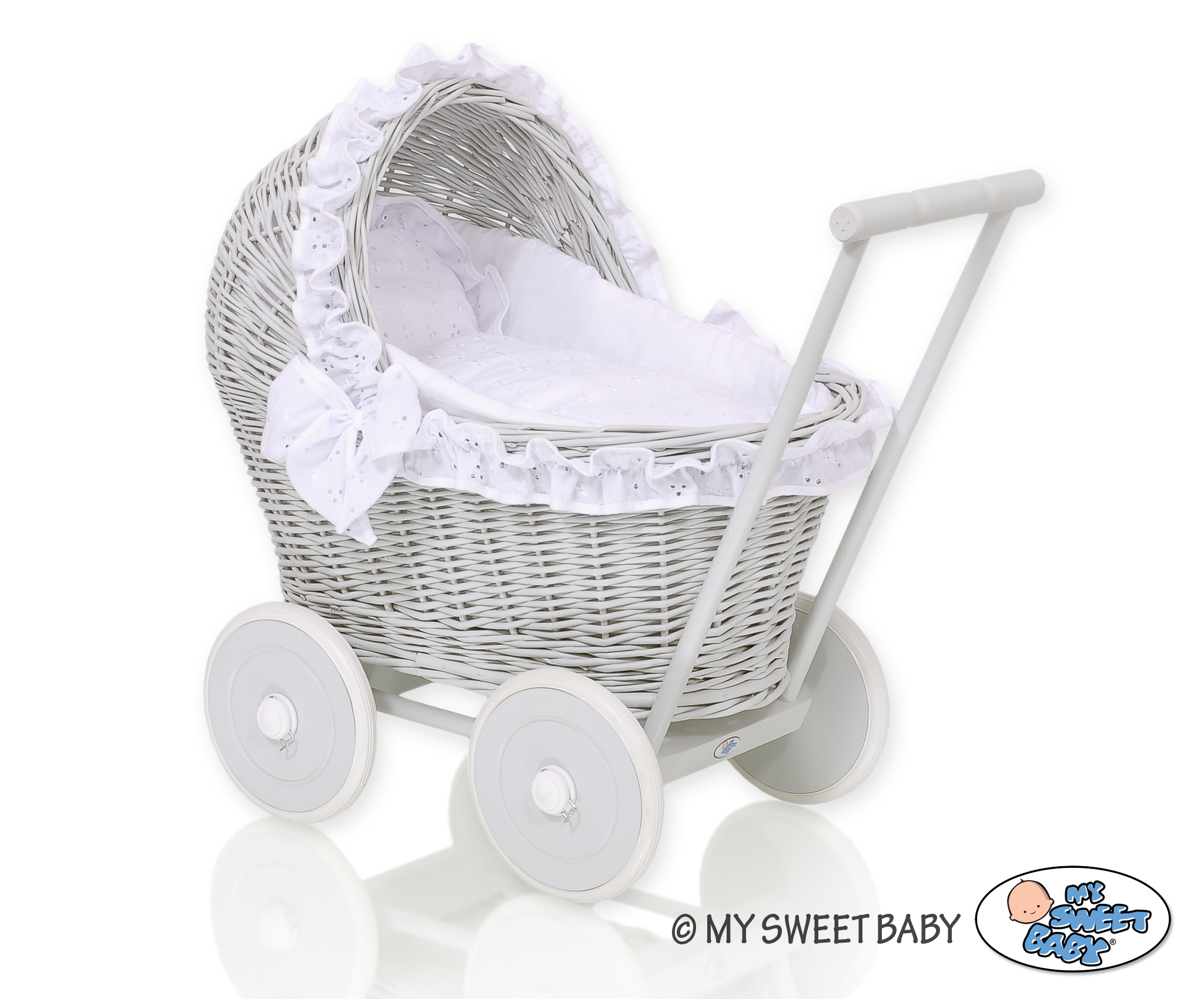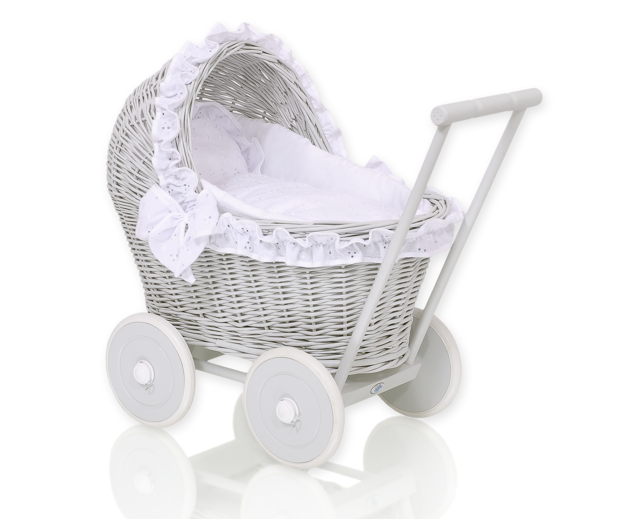 Kleinbaby.nl » Speelgoed Knuffels » Poppenwagens en Speelgoed » Poppenwagen van Riet » Poppenwagen Riet Grijs » Poppenwagen riet met kap Wit Grijs