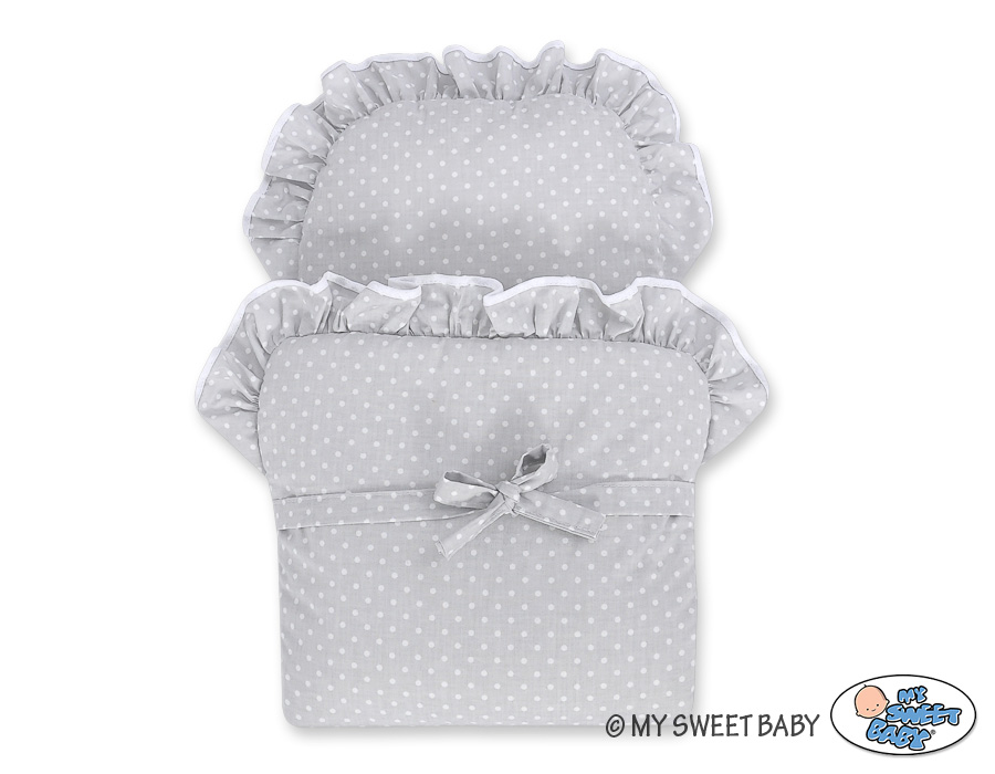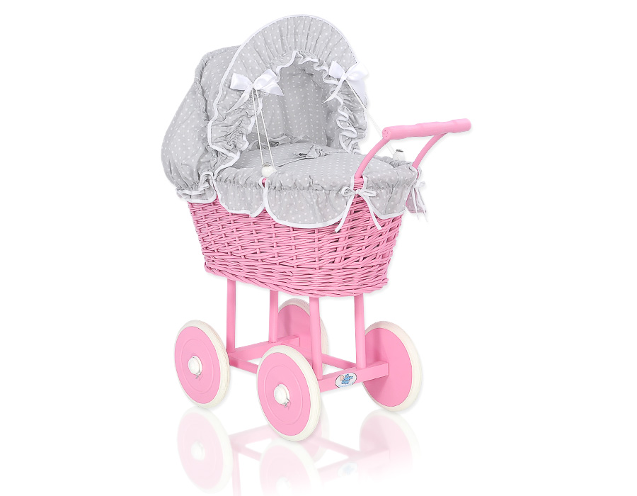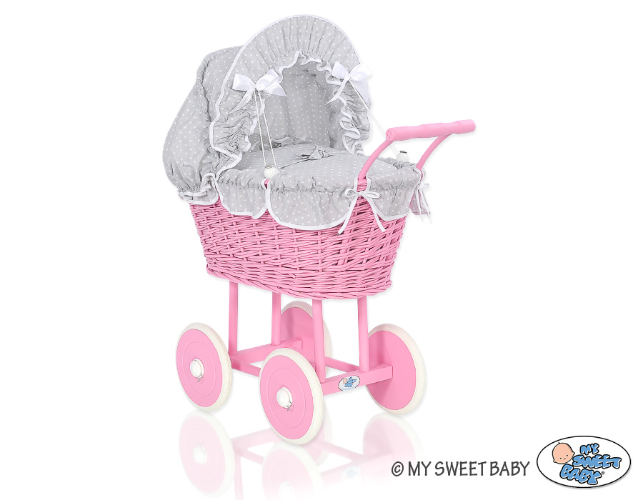Kleinbaby.nl » Speelgoed Knuffels » Poppenwagens en Speelgoed » Poppenwagen van Riet » Rieten Poppenwagen Donker Roze » Poppenwagen riet met kap Wit Grijs Polkaprikker