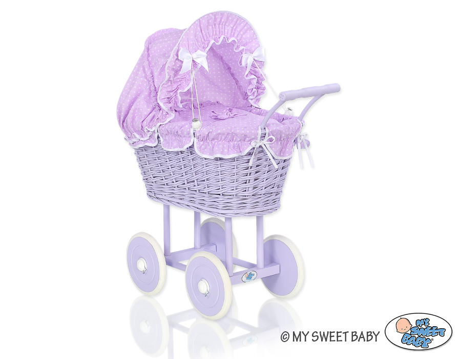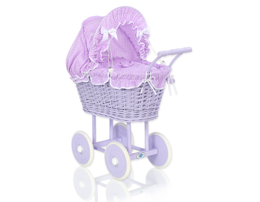 Kleinbaby.nl » Speelgoed Knuffels » Poppenwagens en Speelgoed » Poppenwagen van Riet » Poppenwagen van paars rotan » Poppenwagen riet met kap Wit Purper Polkaprikker