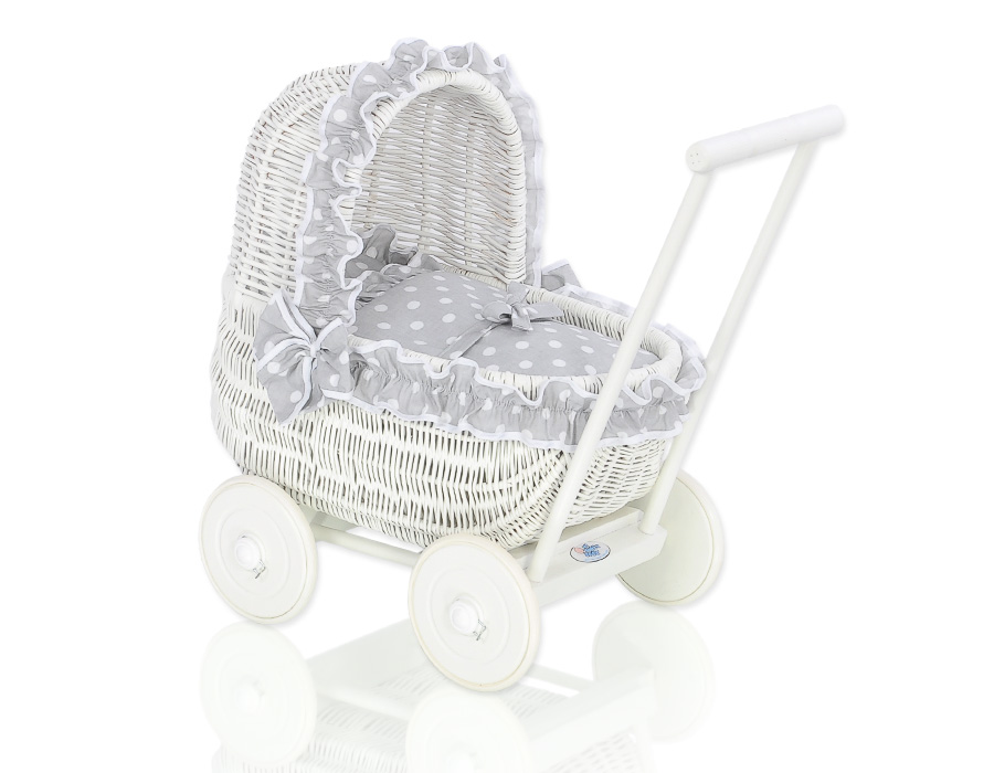 Poppenwagen Riet  Wit Grijs Polkaprikker