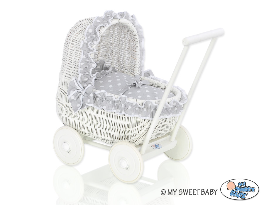 Kleinbaby.nl » Speelgoed Knuffels » Poppenwagens en Speelgoed » Poppenwagen van Riet » Rieten Poppenwagens » Poppenwagen Riet Wit Grijs Polkaprikker