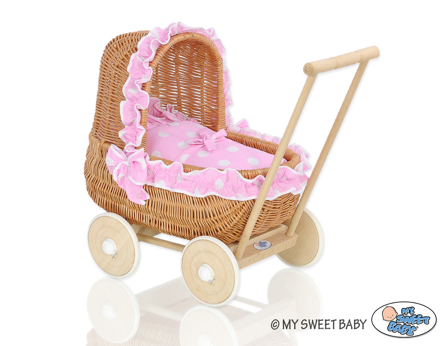 Kleinbaby.nl » Speelgoed Knuffels » Poppenwagens en Speelgoed » Poppenwagen van Riet » Poppenwagen Natuurlijke versie » Poppenwagen Rotan Roze Polkaprikker