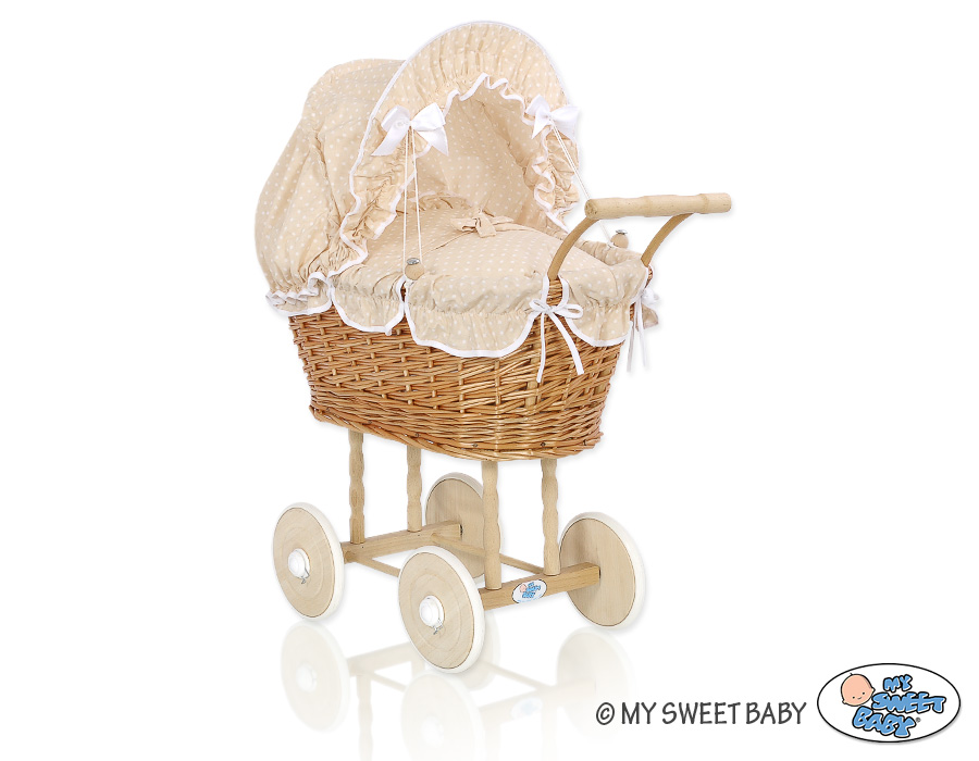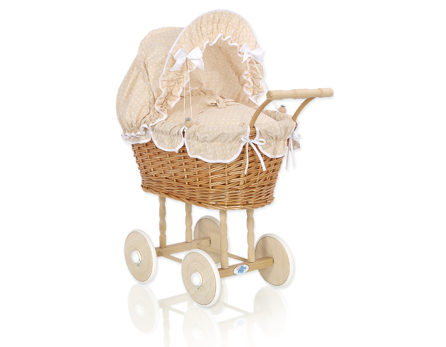 Kleinbaby.nl » Speelgoed Knuffels » Poppenwagens en Speelgoed » Poppenwagen van Riet » Poppenwagen Natuurlijke versie » Poppenwagen Rotan Wit Beige Polkaprikker