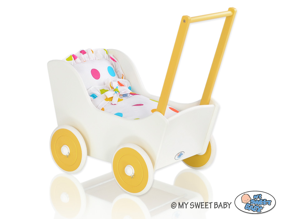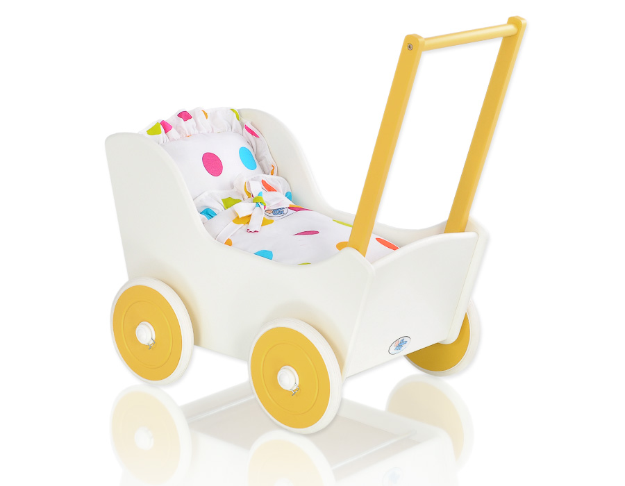 Kleinbaby.nl » Speelgoed Knuffels » Poppenwagens en Speelgoed » Houten Poppenwagen » Poppenwagen van Hout Geel » Poppenwagen van Hout met Dekentje Wit Geel