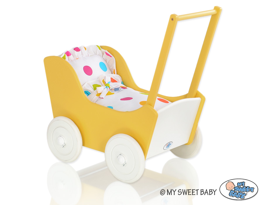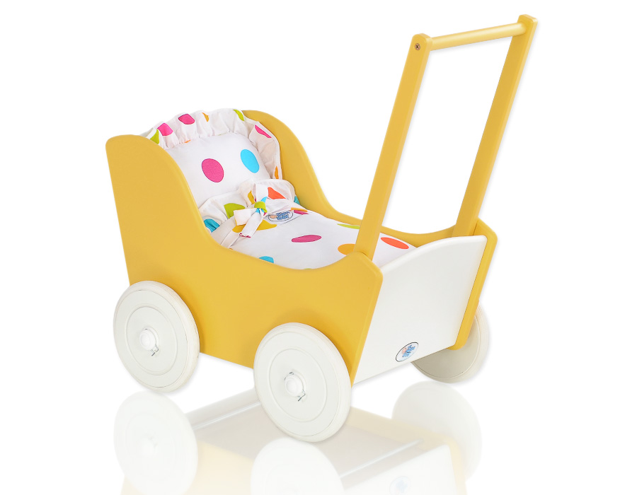Kleinbaby.nl » Speelgoed Knuffels » Poppenwagens en Speelgoed » Houten Poppenwagen » Poppenwagen van Hout Geel » Poppenwagen van Hout met Dekentje Wit Geel