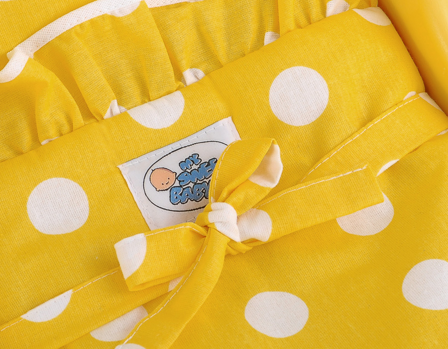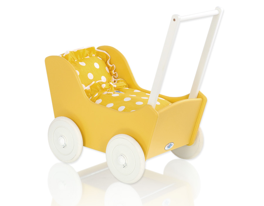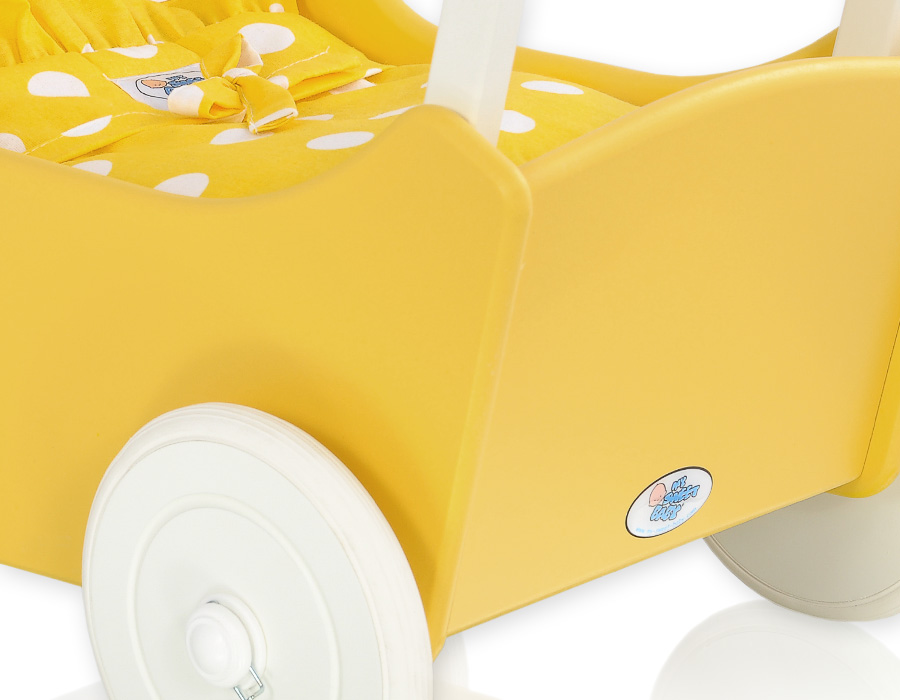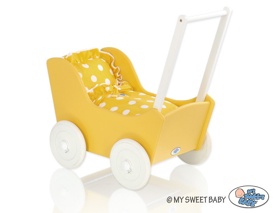 Kleinbaby.nl » Speelgoed Knuffels » Poppenwagens en Speelgoed » Houten Poppenwagen » Poppenwagen van Hout Geel » Poppenwagen van Hout met Dekentje Wit Geel Polkaprikker