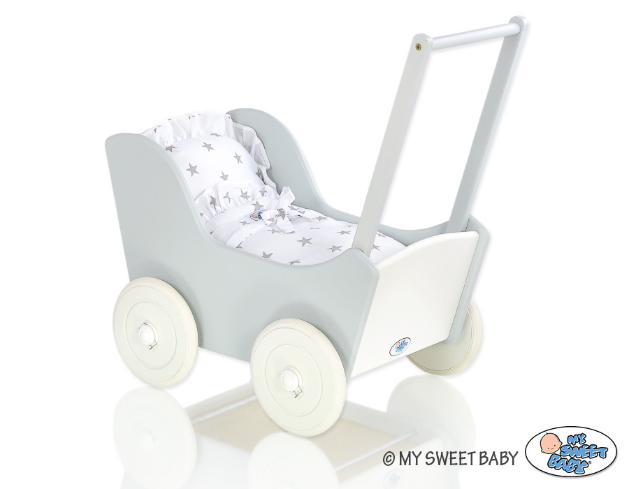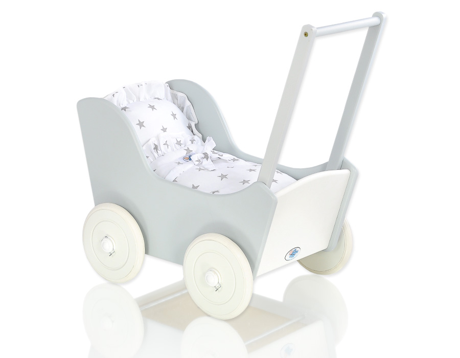 Kleinbaby.nl » Speelgoed Knuffels » Poppenwagens en Speelgoed » Houten Poppenwagen » Houten Poppenwagen Grijs » Poppenwagen van Hout met Dekentje Wit Grijs