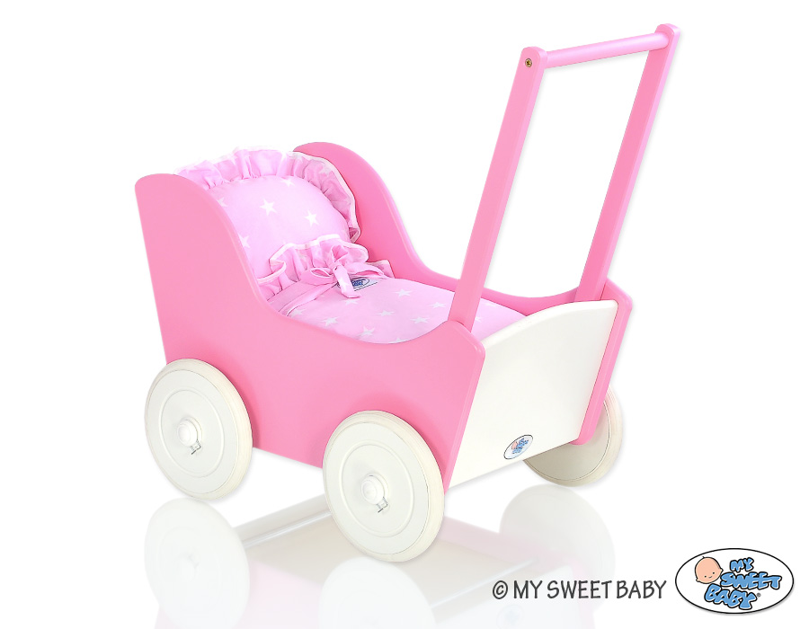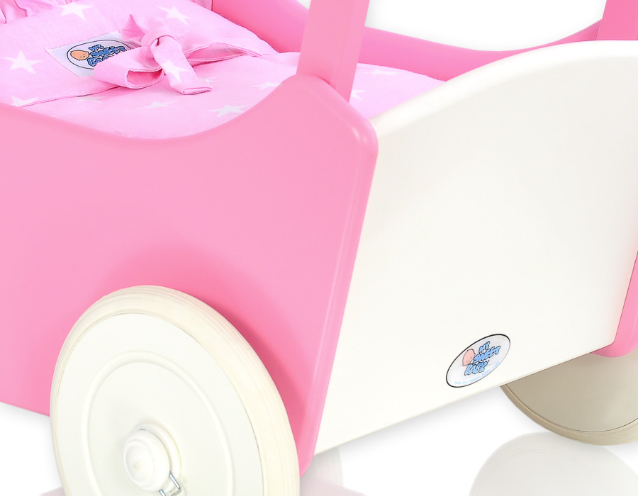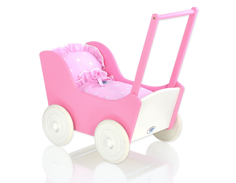 Geweldig cadeau voor een kleine meid. De poppenwagen is hét topproduct voor kinderen. Gemaakt van veilige materialen en geverfd met ecologische verf. De wielen zijn met een klikmechanisme gemonteerd op metalen assen, wat ze soepeler doet draaien.