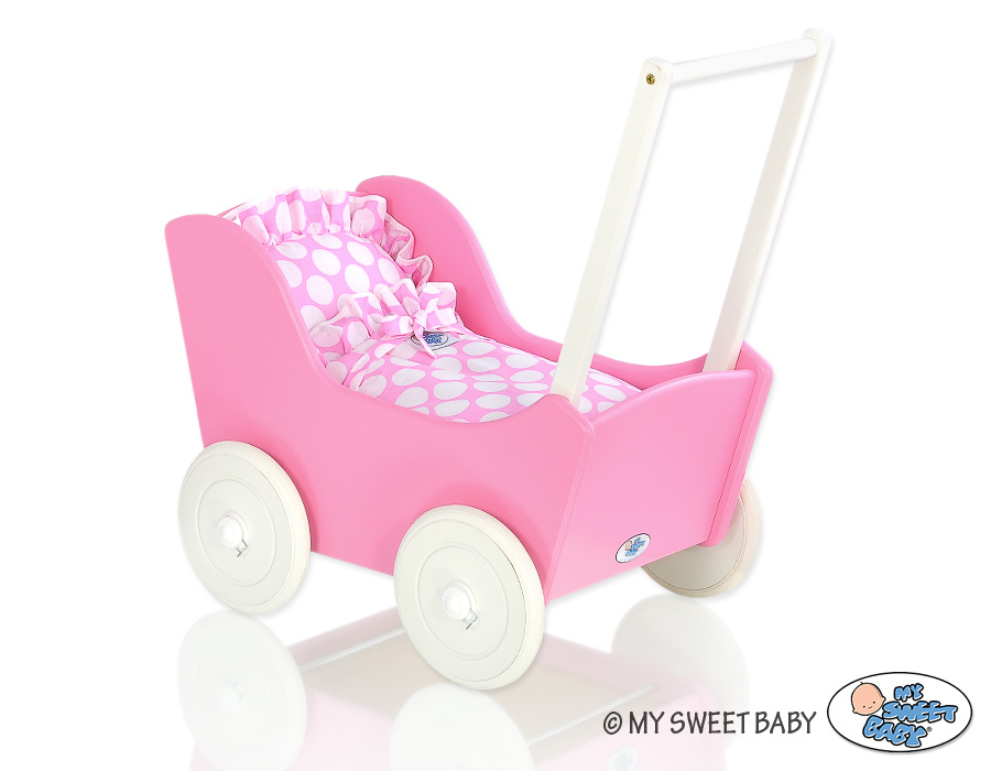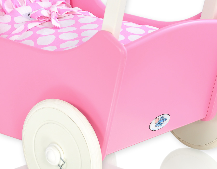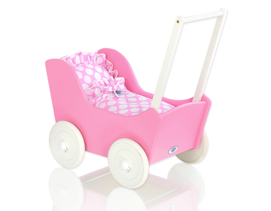 Geweldig cadeau voor een kleine meid. De poppenwagen is hét topproduct voor kinderen. Gemaakt van veilige materialen en geverfd met ecologische verf. De wielen zijn met een klikmechanisme gemonteerd op metalen assen, wat ze soepeler doet draaien.