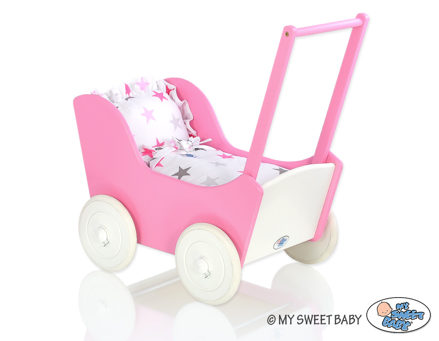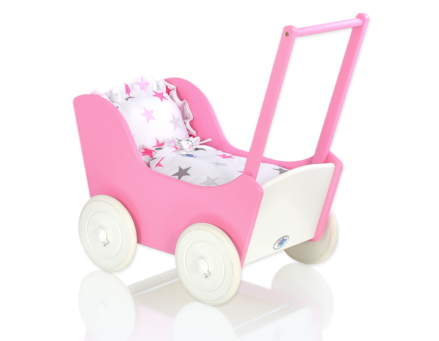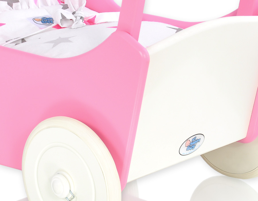 Geweldig cadeau voor een kleine meid. De poppenwagen is hét topproduct voor kinderen. Gemaakt van veilige materialen en geverfd met ecologische verf. De wielen zijn met een klikmechanisme gemonteerd op metalen assen, wat ze soepeler doet draaien.