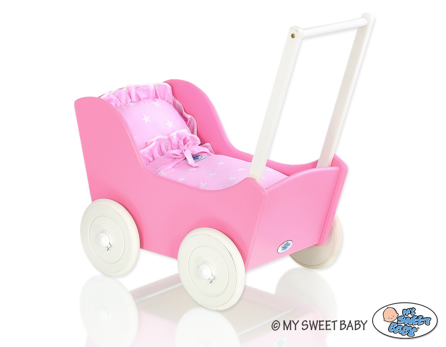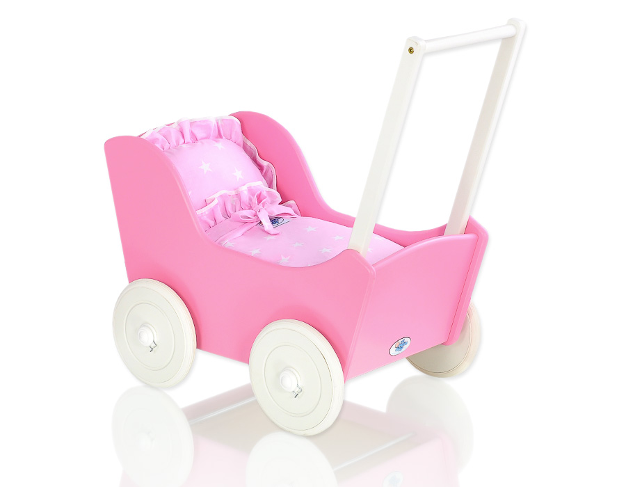 Geweldig cadeau voor een kleine meid. De poppenwagen is hét topproduct voor kinderen. Gemaakt van veilige materialen en geverfd met ecologische verf. De wielen zijn met een klikmechanisme gemonteerd op metalen assen, wat ze soepeler doet draaien.