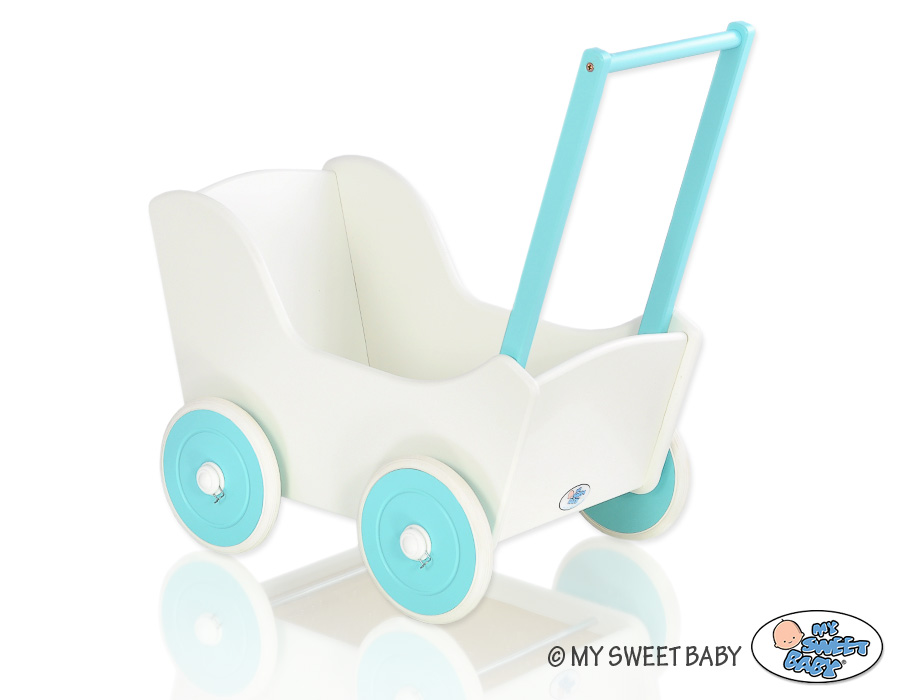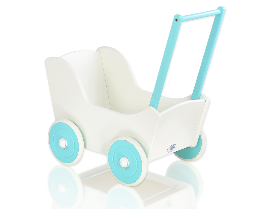 Kleinbaby.nl » Speelgoed Knuffels » Poppenwagens en Speelgoed » Houten Poppenwagen » Houten Poppenwagens Turkoois » Poppenwagen van Hout Wit Turkoois