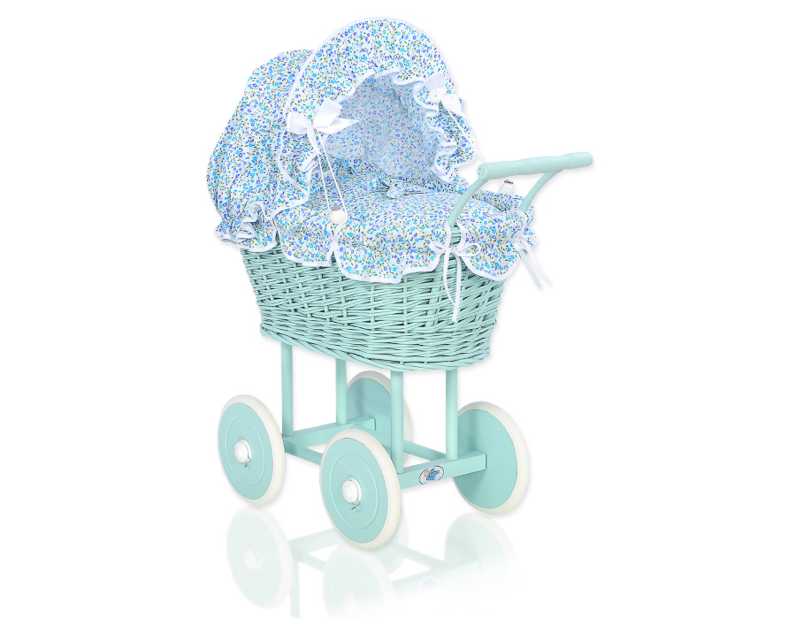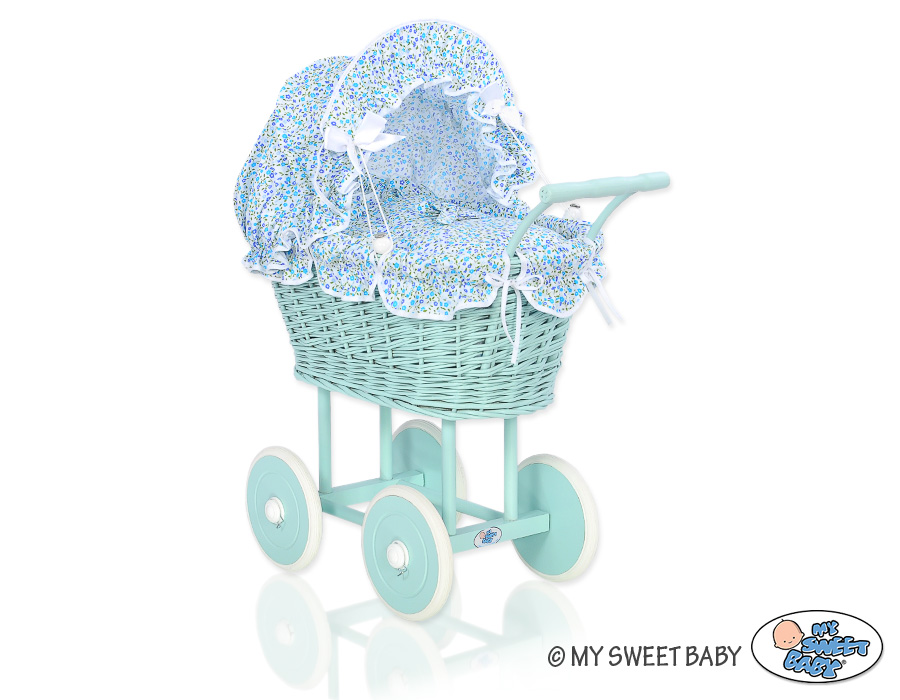 Kleinbaby.nl » Speelgoed Knuffels » Poppenwagens en Speelgoed » Poppenwagen van Riet » Houten Poppenwagen Mint » Poppenwagen van riet Blauw Mint Bloemenweide Bloemen