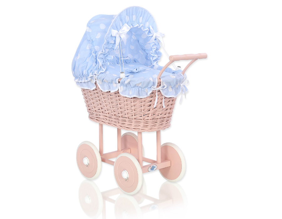 Poppenwagen van riet Blauw Polkaprikker Poederroze