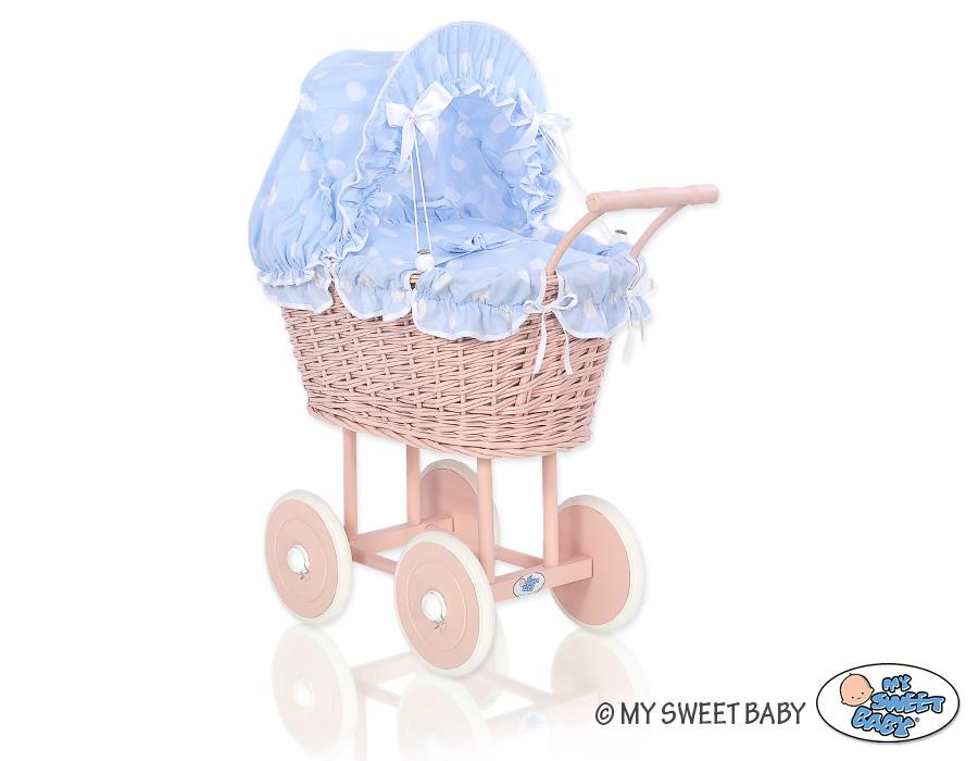 Kleinbaby.nl » Speelgoed Knuffels » Poppenwagens en Speelgoed » Poppenwagen van Riet » Poppenwagen Riet Poederroze » Poppenwagen van riet Blauw Polkaprikker Poederroze