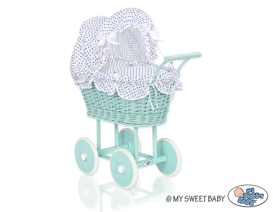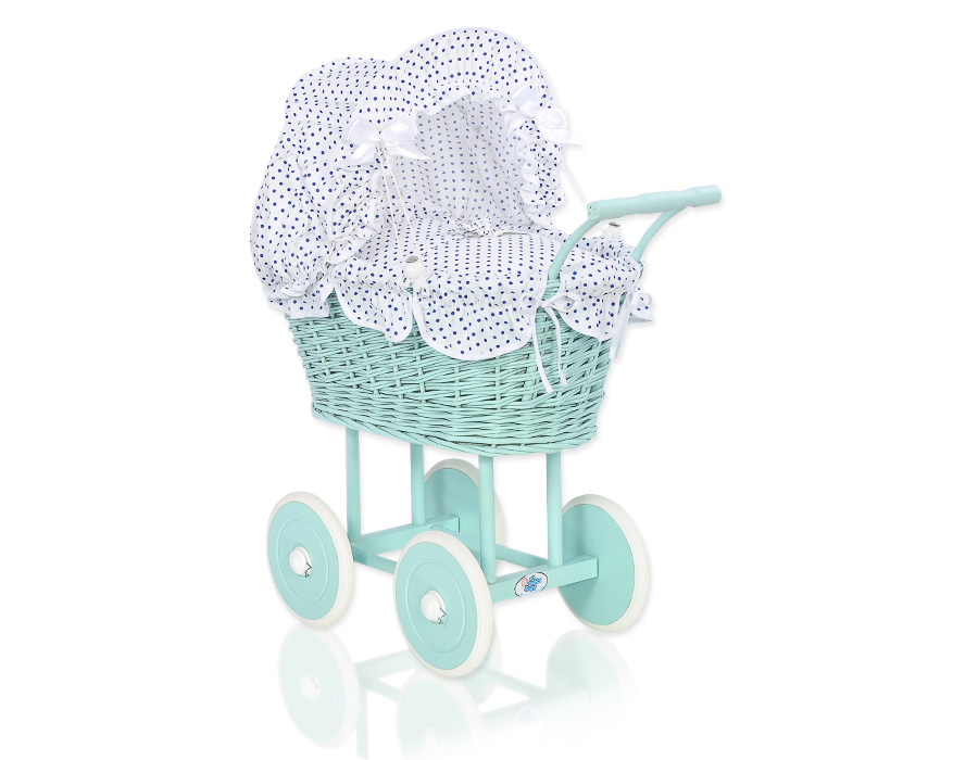 Kleinbaby.nl » Speelgoed Knuffels » Poppenwagens en Speelgoed » Poppenwagen van Riet » Houten Poppenwagen Mint » Poppenwagen van riet Mint Wit Marineblauw Polkaprikker