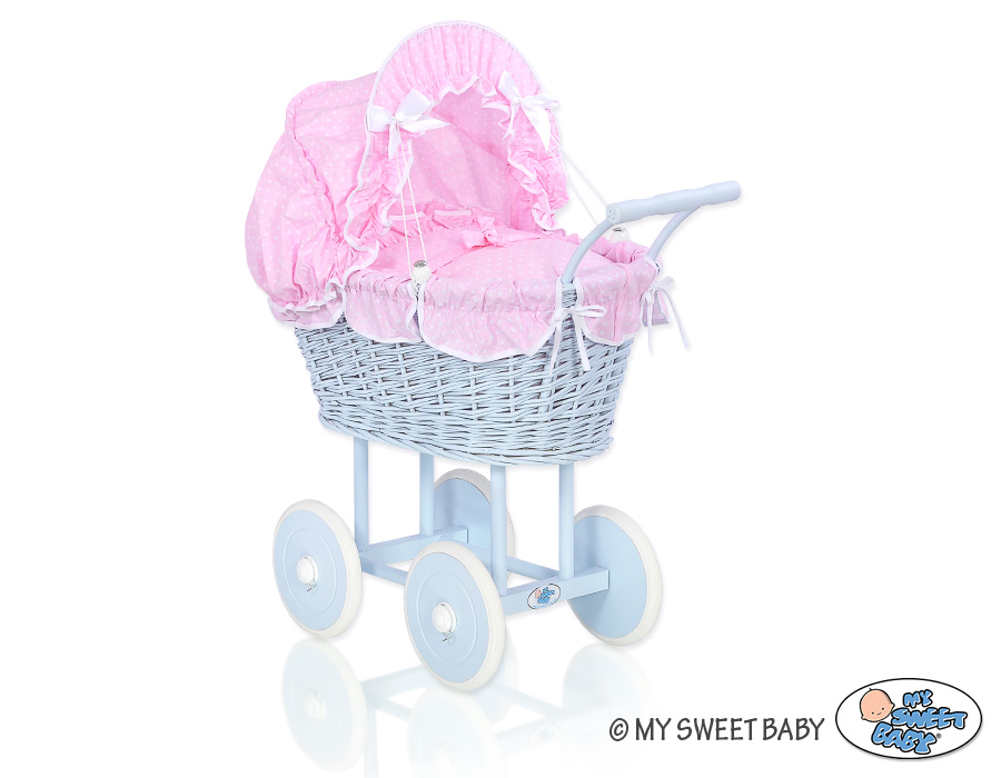 Kleinbaby.nl » Speelgoed Knuffels » Poppenwagens en Speelgoed » Poppenwagen van Riet » Rieten Poppenwagens Blauw » Poppenwagen van riet Roze Wit Blauw Polkaprikker