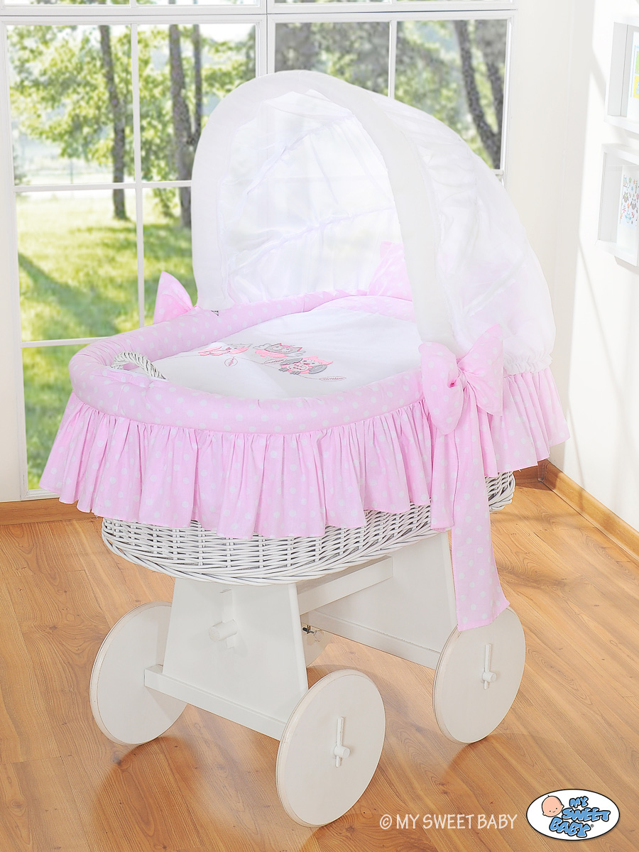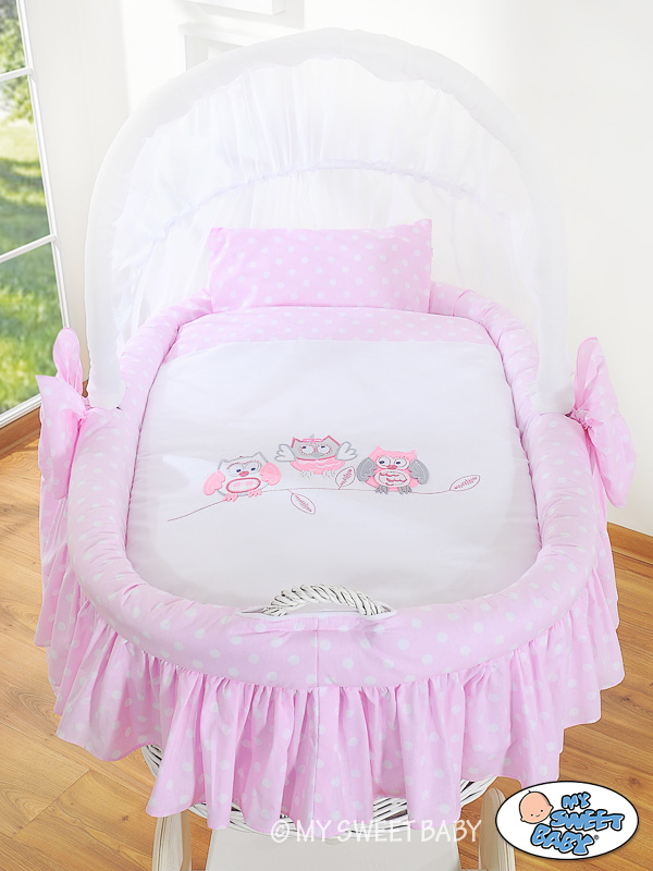 Rieten Babymand met Kap Roze Gelukkige Uilen